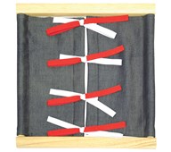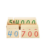 En trälåda som innehåller små träbrickor med gröna ental, blåa tiotal, röda hundratal och gröna tusental (1, 10, 100, 1 000 är tryckta på brickorna). Marker och käglor i samma färger. Konkret material för beräkningar i alla räknesätt. Barnet kan arbeta vidare med addition, subtraktion, multiplikation och division på egen hand. Materialet kan även användas till en grupp barn som ett växelspel tillsammans med en eller flera tärningar. Från 6 år.