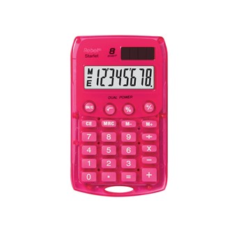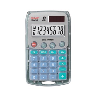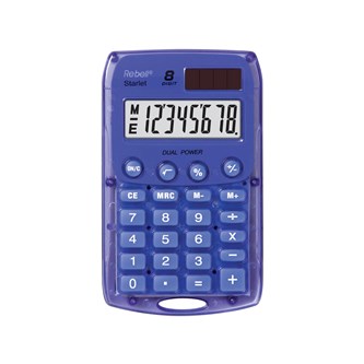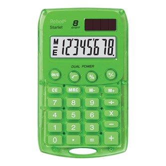 Grundskoleräknare med stor 8-siffrig display. Funktioner: de fyra räknesätten, %, roten ur, teckenbyte +/-, pålägg och oberoende minne. Kombinerad solcells- och batteridrift. Batteri ingår. Automatisk avstängning. Finns i 5 olika färger. Mått: B67xH113xD12 mm.
