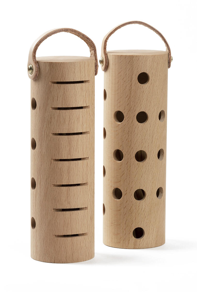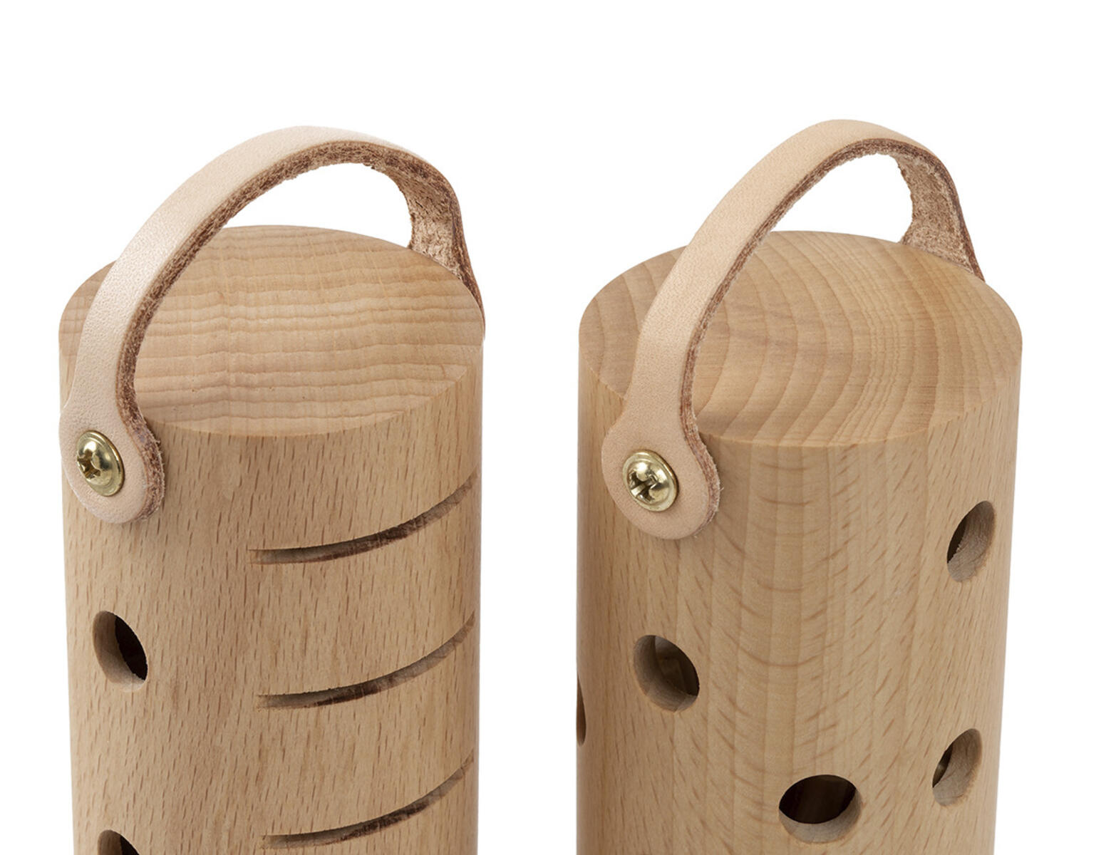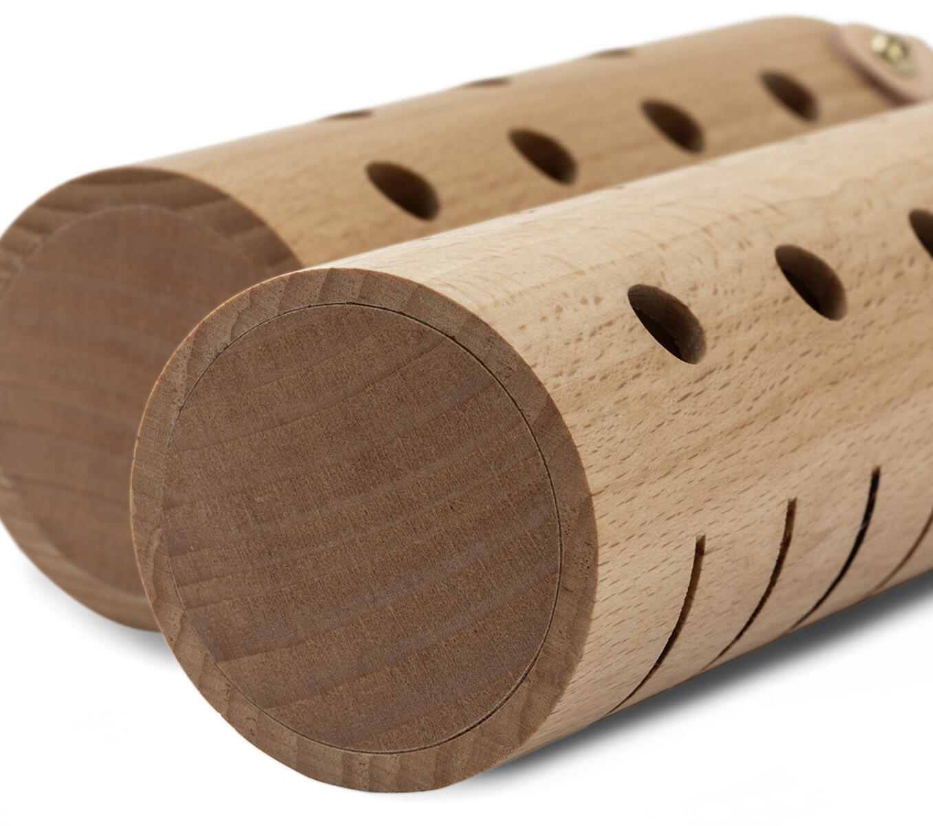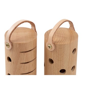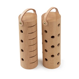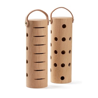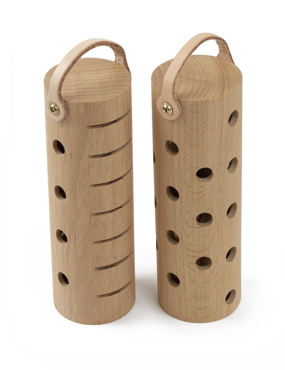 Tre instrument är gömda i den här unika uppfinningen: minicajon, trumma och bongo. Den kan spelas med fingrarna på framsidan som en cajon, och på baksidan som en bongo. Man kan även sjunga in i instrumentet genom ett av hålen och få fram ett saxofonliknande ljud. Mått: 12 cm.