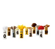 225 delar/fp. Siffror och bokstäver i nordiska alfabetet. 5 st av varje siffra/bokstav. Tillverkade av vitlaserad plywood. Typerna kan målas eller ritas på med kritor och färgpennor. Varje del mäter ca 2,5x4 cm. Tjocklek 2,5 mm. Levereras i obehandlad ask av plywood med fack för varje typ. PVC-fri. Från 3 år.