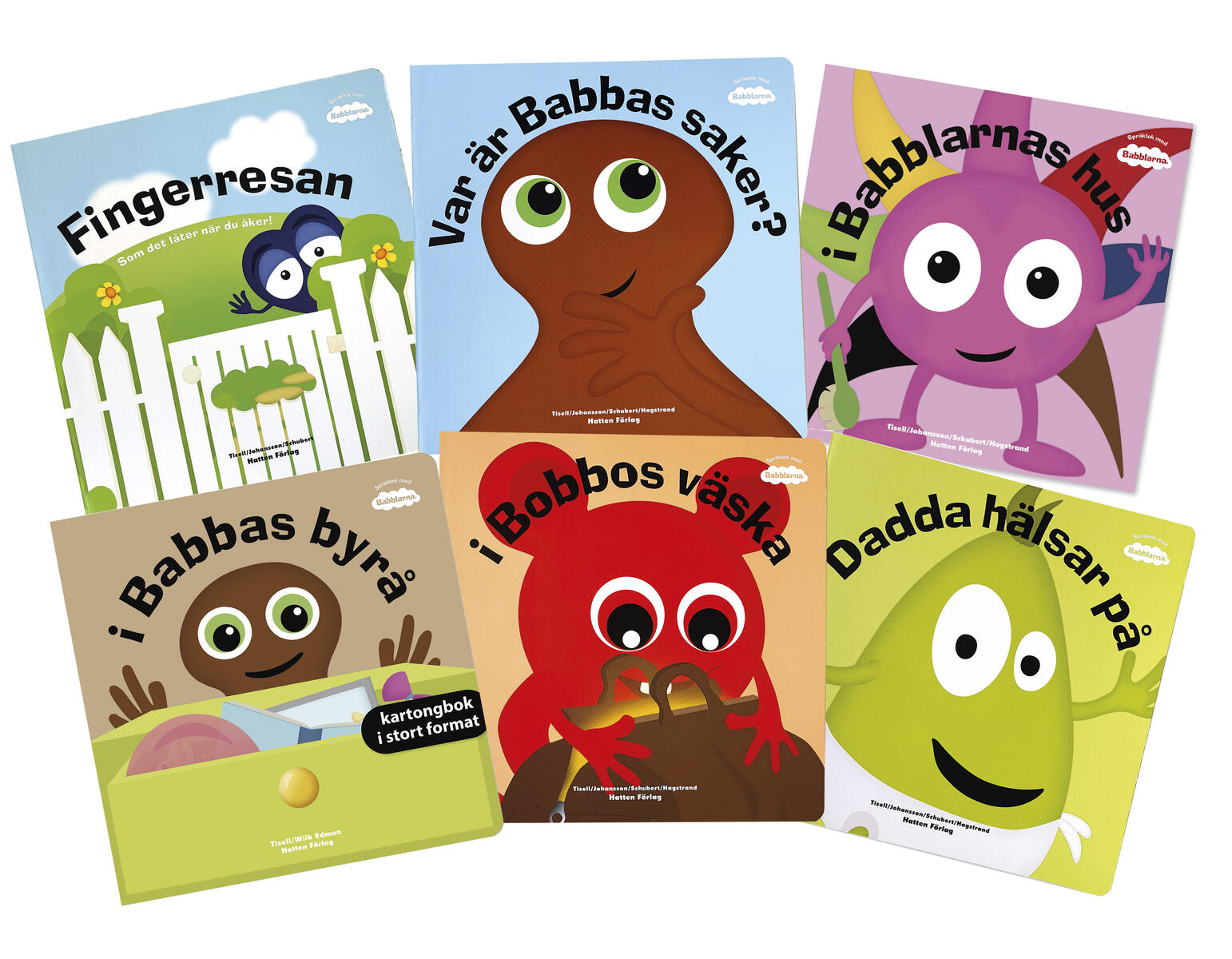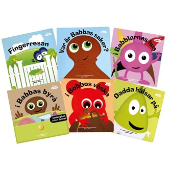 Ett stort paket med 10 böcker från Babblarna: Var är Babbas saker?, I Bobbos väska, Kalas hos Babblarna, Dadda hälsar på, I Babblarnas hus, I Babblarnas prylbod, Natti natti Babblarna, Fingerresan, Babola Salabim och Stompalång med Babblarna.