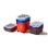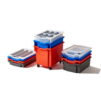 Transparent förvaring med lock och 6 färgade askar som insats. Innehåller 2 gula, 2 blåa och 2 rosa askar. Perfekt förvaring till flera saker i en och samma box. Av polypropen. Mått 40x30x18 cm.