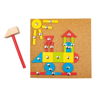 177 delar. Med lite skicklighet och fantasi kan barnen skapa fina motiv och mönster. Använd hammaren och spika fast träformerna i korkplattan. Tränar barnens motoriska färdigheter och koordination. Innehåller: 2 korkplattor 29x21x1 cm, 2 hammare av trä, 73 träbrickor och 80 nubb. PVC-fri. Från 4 år.
