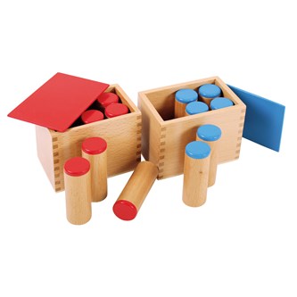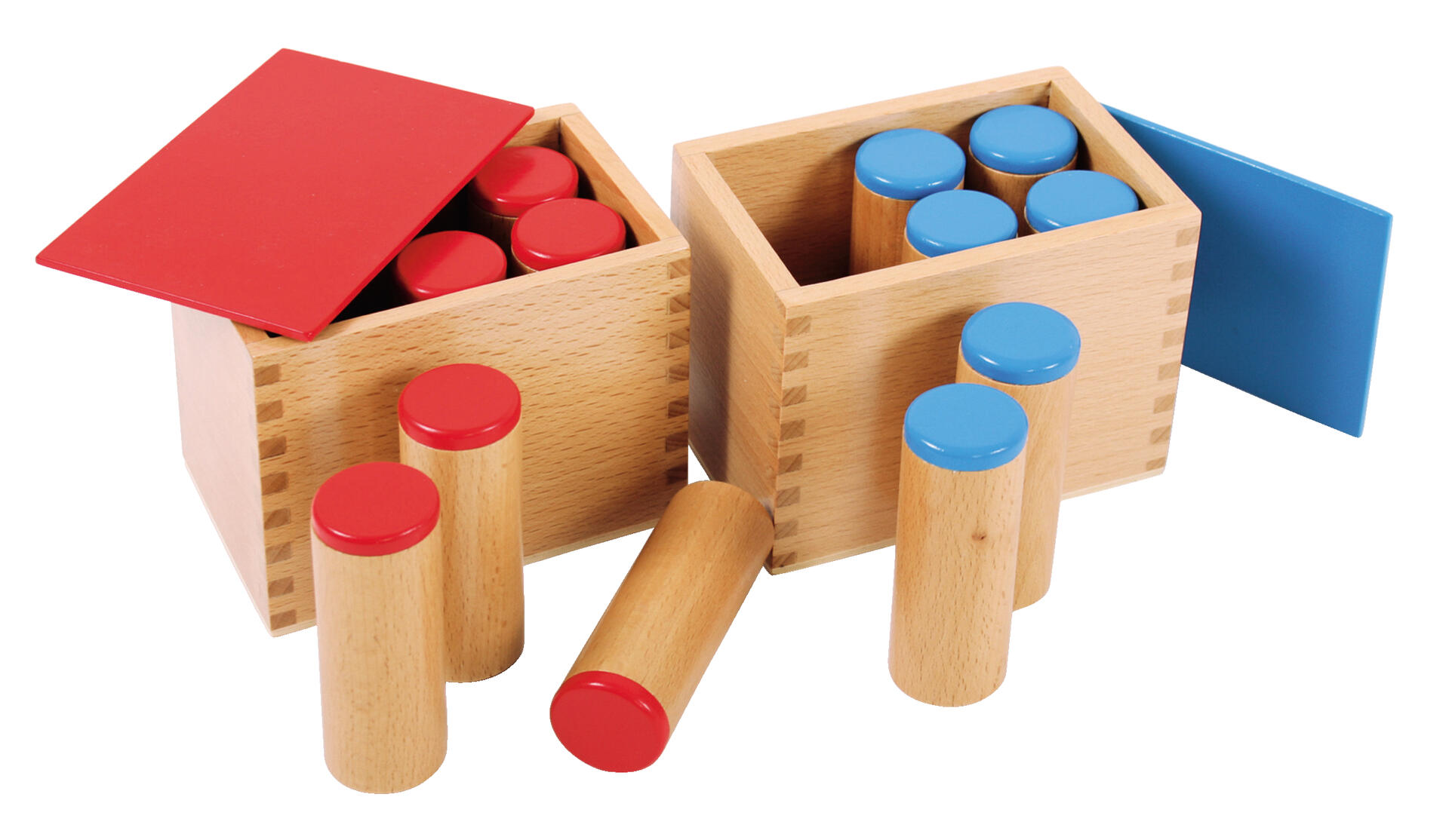 Består av 2 trälådor, som var och en innehåller 6 träcylindrar med röda respektive blå lock. När cylindrarna skakas ger de ifrån sig olika ljud och barnet skall bland annat para ihop och gradera de båda seten. Tränar hörsel och koncentration.