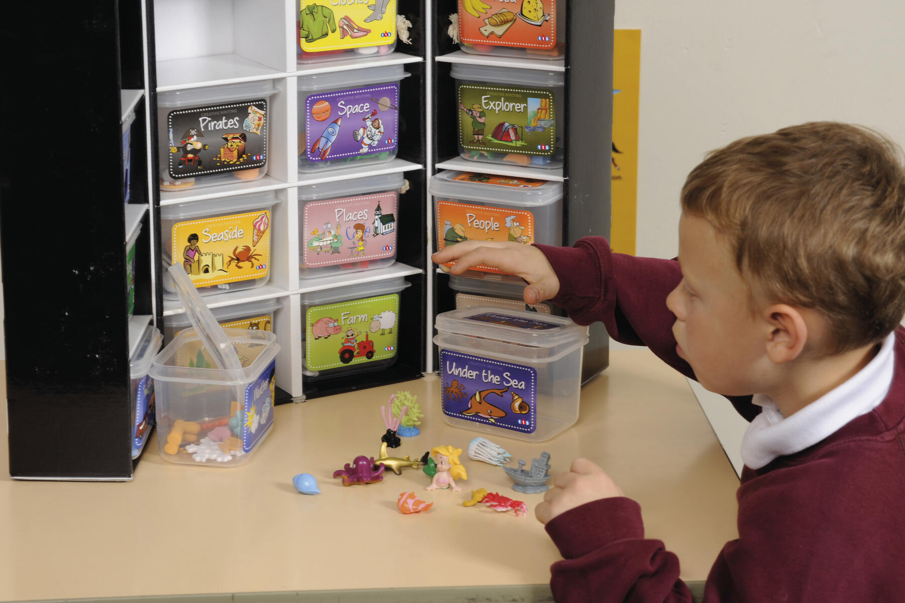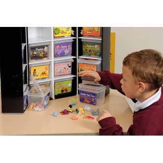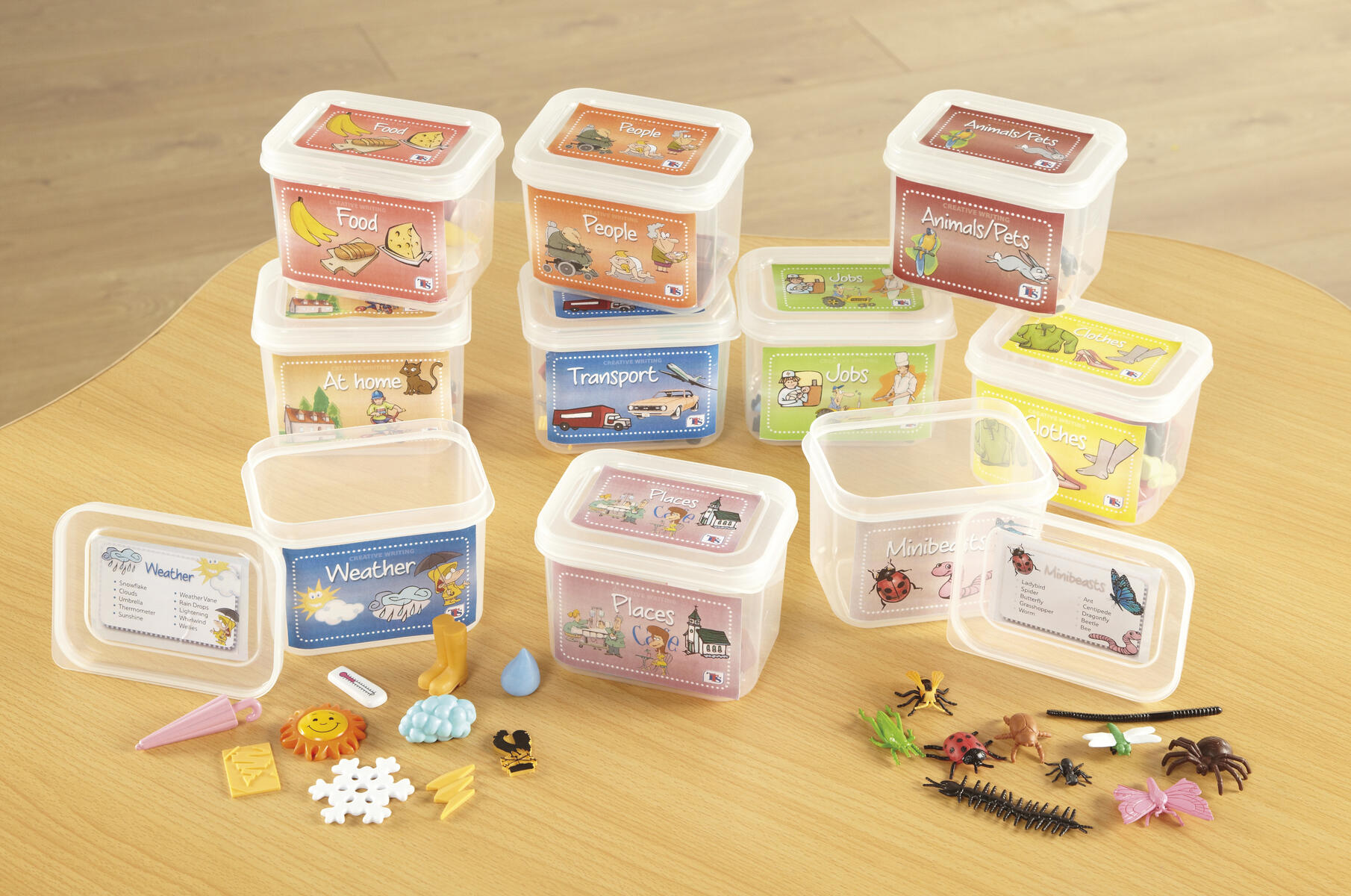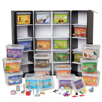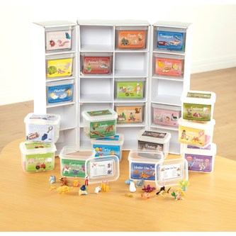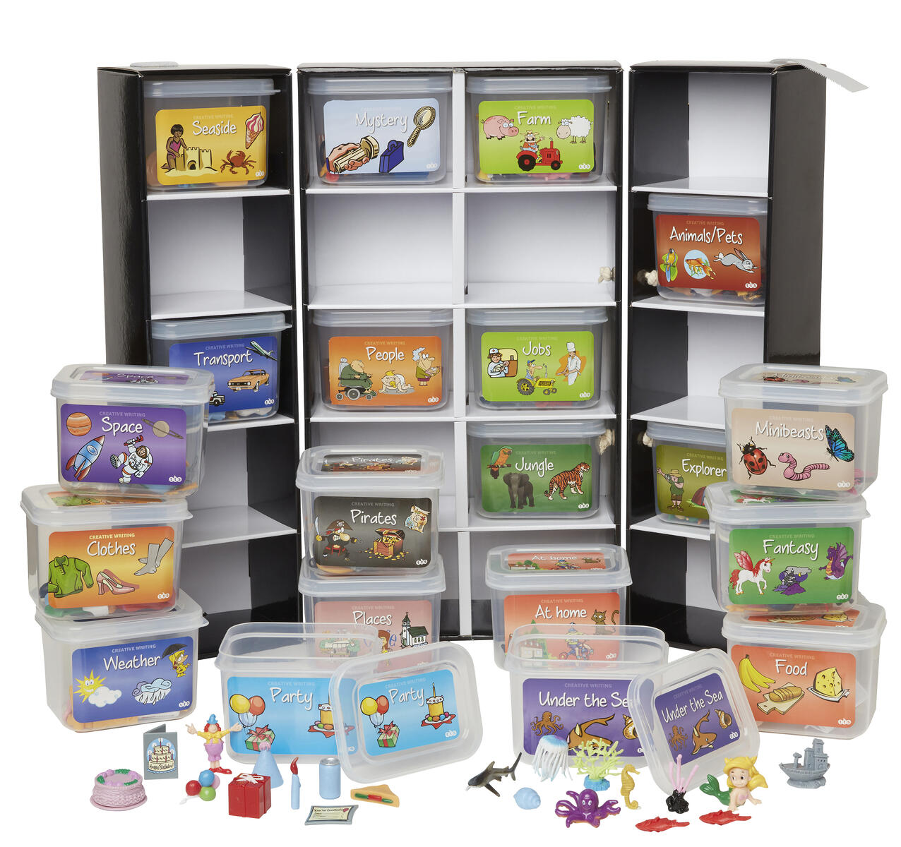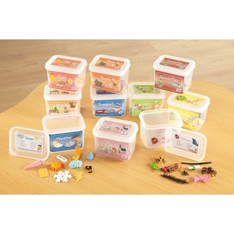 Ett bibliotek med inspiration för att skriva och berätta. Varje låda är ett populärt ämne och innehåller ett urval av saker och figurer för att inspirera till att skriva både fantasi- och faktaberättelser. Idealiska för att använda vid stimulerande diskussioner innan det är dags att skriva för att sätta gnista på olika intressen och idéer. 10 figurer i varje burk. Linnea som är lärare i årskurs 1 har använt lådorna och säger följande: ”Figurerna har vi använt till att skriva korta texter där eleverna fått inspiration av figurerna, vilket också har varit en favorit hos eleverna.” PVC-fri. Från 3 år.