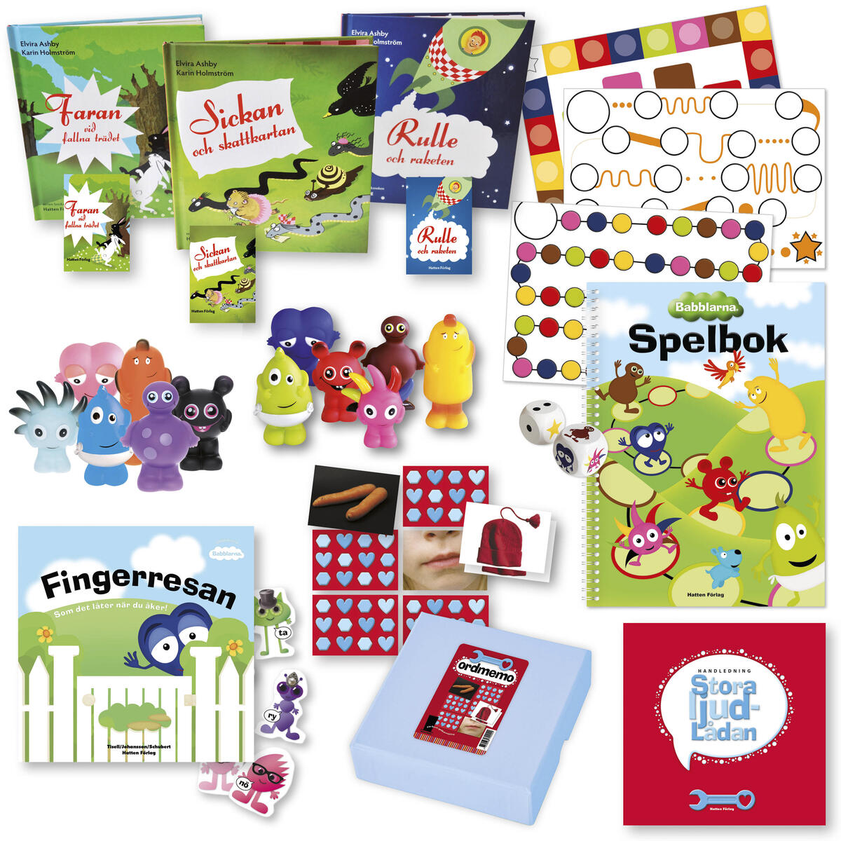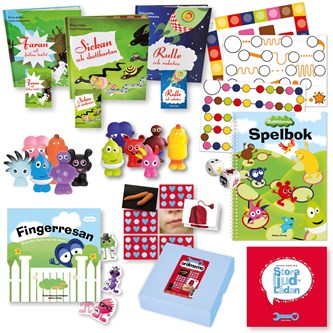 Lek och spela samtidigt som du tränar uttal! Stora språkpaketet med ljud innehåller bland annat boken Fingerresan, Babblarnafigurer och Babblarnas spelbok för träning av alla språkljud mellan himmel och jord. För ljud som brukar krångla lite extra finns även Snicksnacksnokens böcker och kortlekar, och handledningen är full av tips på lekar och spel för riktigt rolig uttalsträning. Innehåller boken Fingerresan inkl. pappfigurer ur Babblarna i Konsonantdalen, Babblarna plastfigurer, både BD-set och GS-mix, Babblarnas spelbok, boken Sickan och skattkartan inkl. kortlek, boken Faran vid fallna trädet inkl. kortlek, boken Rulle och raketen inkl. kortlek, Ordmemo och handledning. Allt är förpackat i en praktisk plastbox.