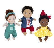 Dockor med verklighetstrogna hudveck och hård kropp. Två flickor och en pojke. Av PVC, utan förbjudna ftalater. Från 3 år.