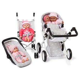 Innehåller docksäng med bäddset, sittvagn, skötväska, docklift och en mjuk docka med docktillbehör. Färger kan variera. Dockans längd är 35 cm. PVC-fri. Från 3 år.