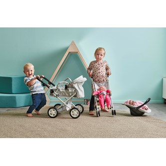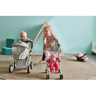 Dockvagnen har ett handtag, som är justerbart för att passa barn med olika längd, samt en mjuk urtagbar bärinsats. Med ett justerbart säte kan dockan ligga och sova eller sitta upp och titta. Fällbar sufflett och praktisk shoppingkorg undertill. Mått: L60xB36xH70 cm. PVC-fri. Från 3 år.
