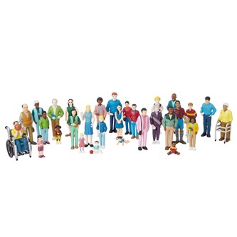30 st/fp. Ett större set med lekfigurer i olika utföranden som utvecklar barnens förståelse och respekt för olika roller, åldrar, kön och mångfald. Av PVC, utan förbjudna ftalater. Från 3 år.