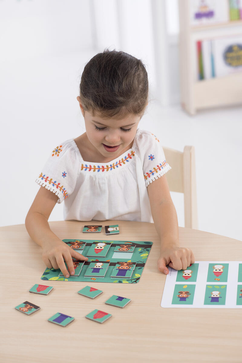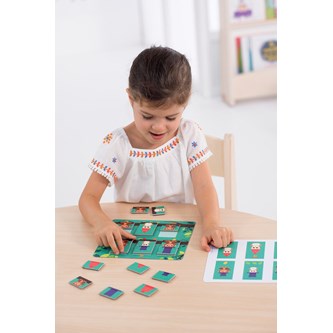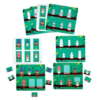 Barnen får här träning i att förklara och sätta ord på sina tankar. Meningen är att skapa situationer där de måste kommunicera med varandra genom att förklara bilden de har framför sig. T.ex. "Jag letar efter en brun apa som har en gul boll framför sig". Upp till fyra deltagare. PVC-fri. Från 4 år.