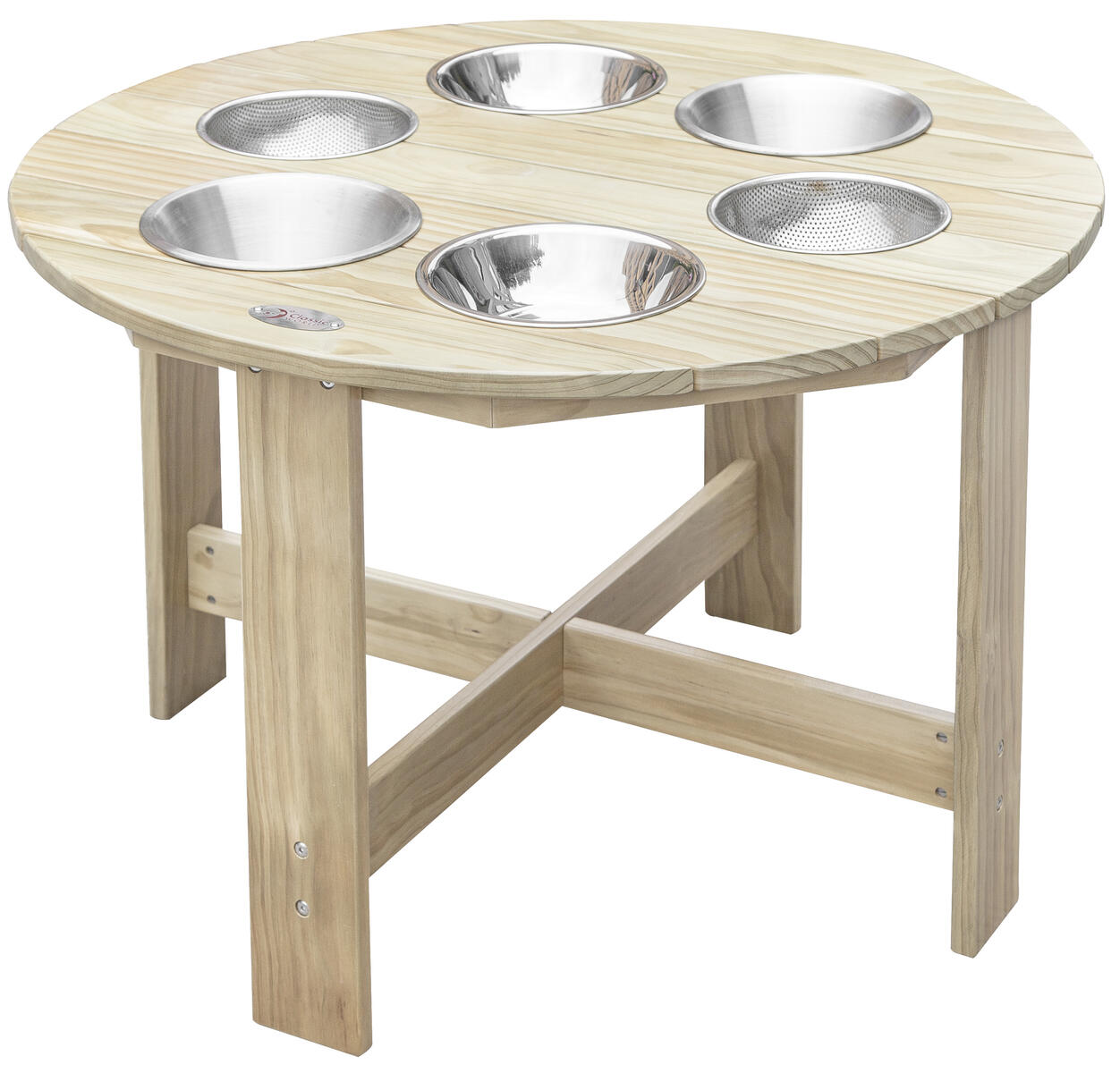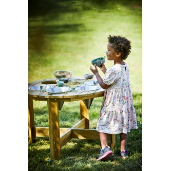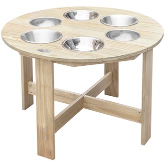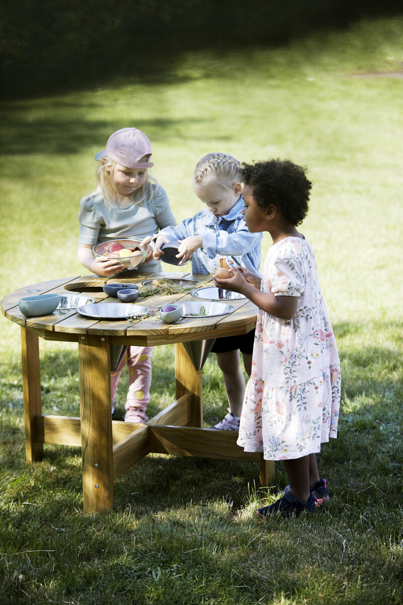 Ett stabilt bord för utomhusbruk med 6 metallskålar av rostfritt stål som kan fyllas med alla typer av material, t.ex. lera och vatten. Man kan arbeta med matematiska begrepp, sortera eller väga. Lämpar sig utmärkt för lärande i grupp. En multifunktionell produkt som öppnar upp för ett fantasifullt sinne. Tillverkad av träskyddsbehandlad furu. Förvara helst på en sval, torr plats inomhus. Levereras omonterat. ø 90 cm. Höjd 60 cm. PVC-fri. Från 3 år. Ämnad för utomhusbruk.