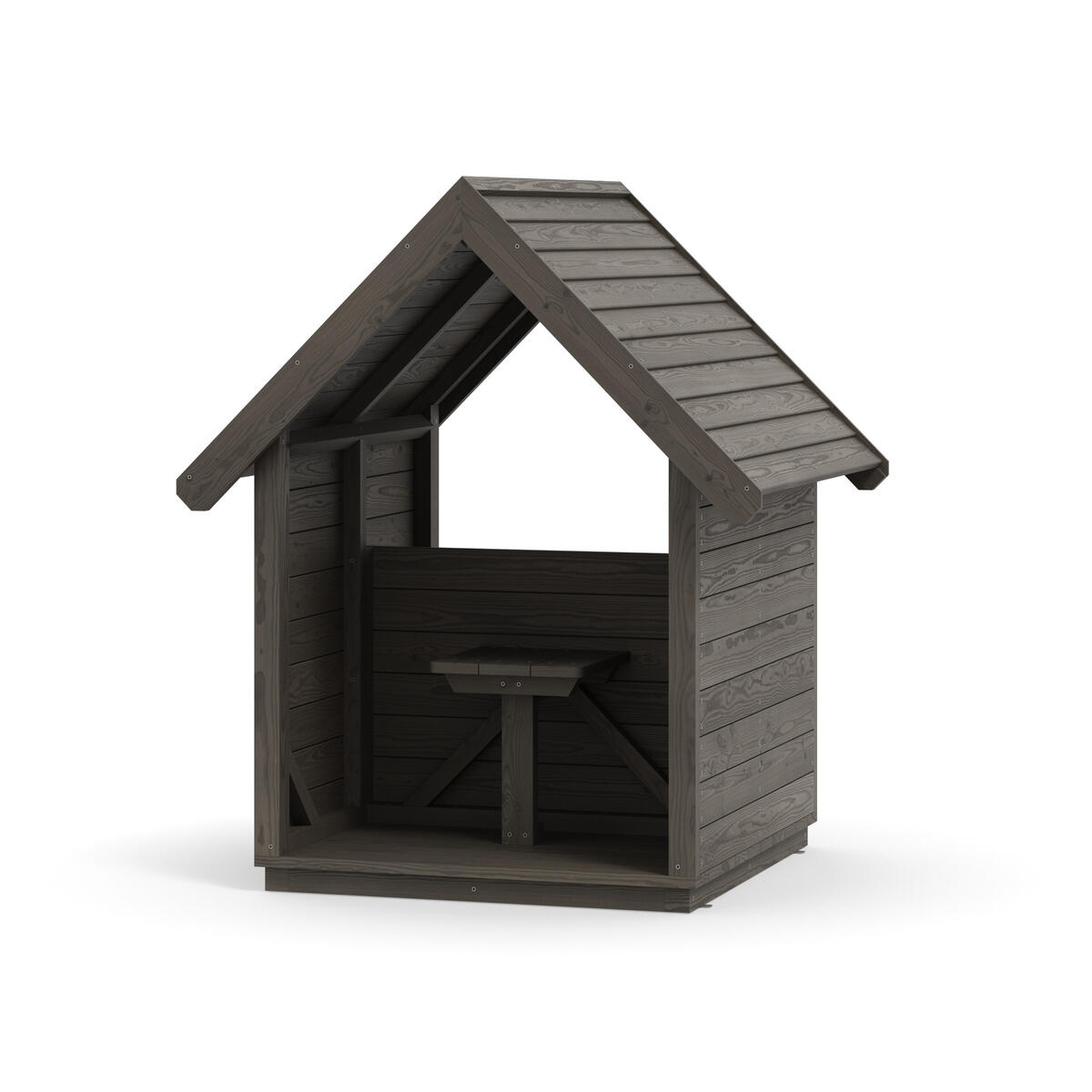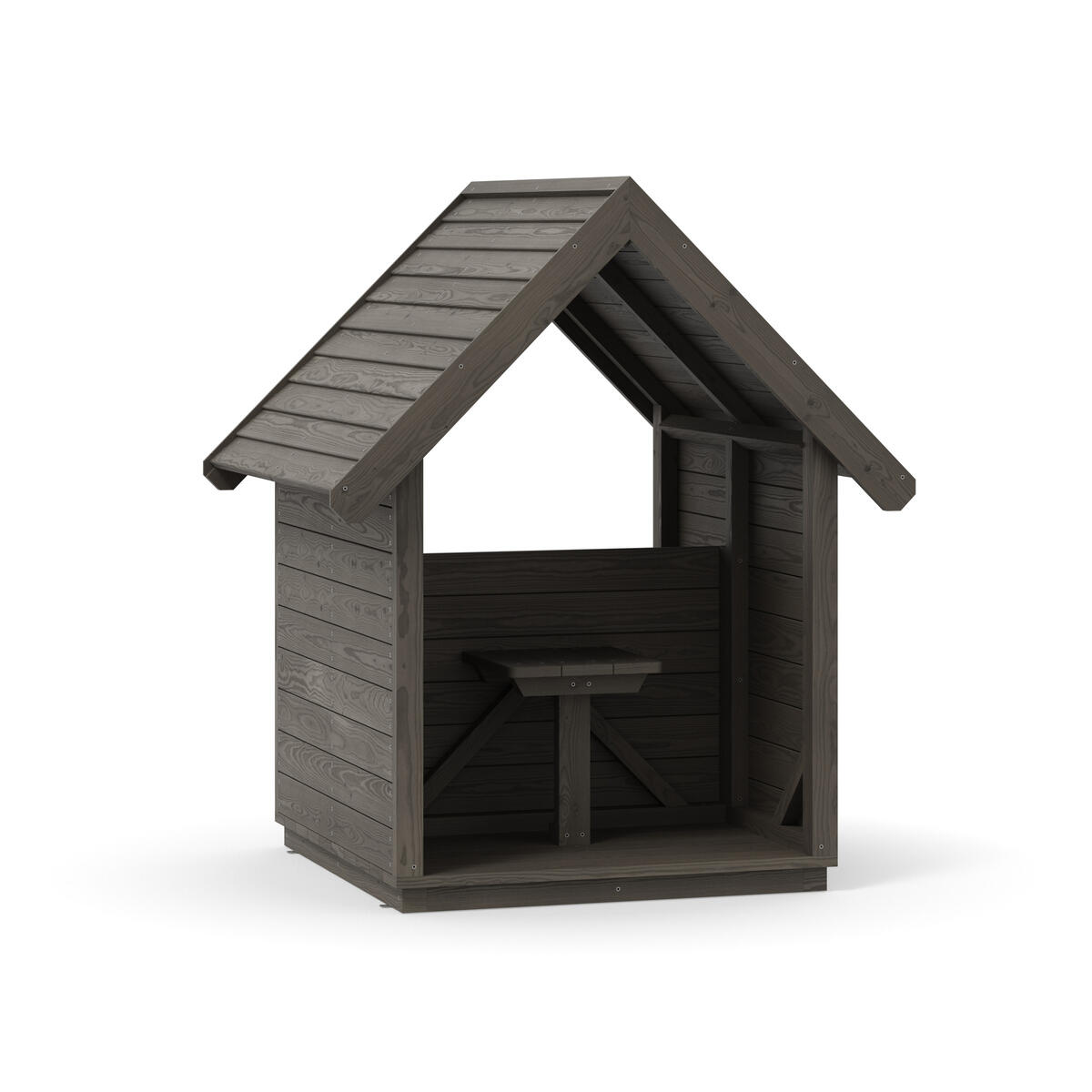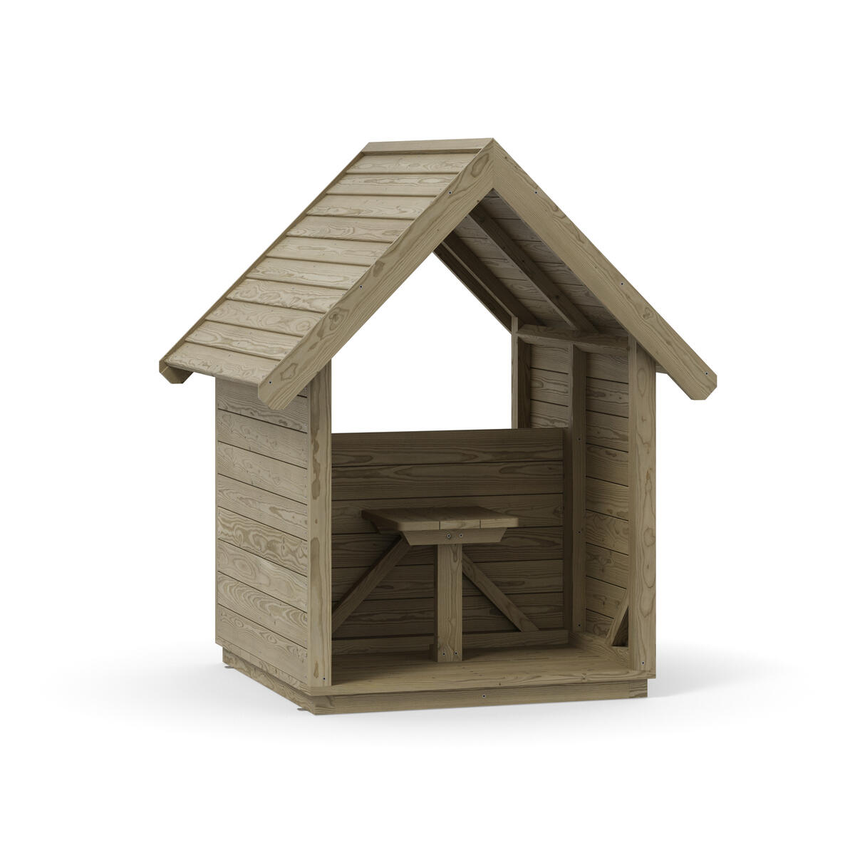 Ett lekhus i robinia utan golv. Kan t.ex. placeras direkt i sandlådan. Sittbänkar på båda sidorna i huset, samt ett bord. För exakta mått och övrig information, se dokument.