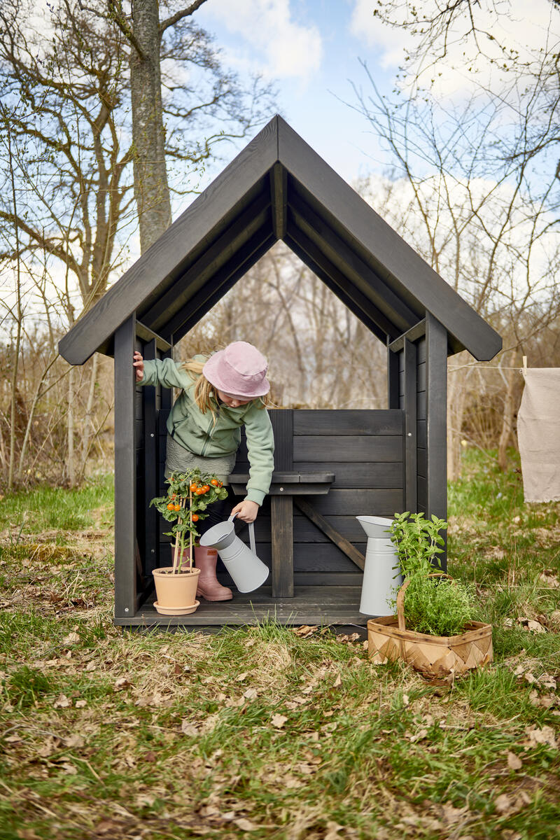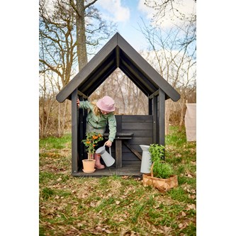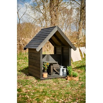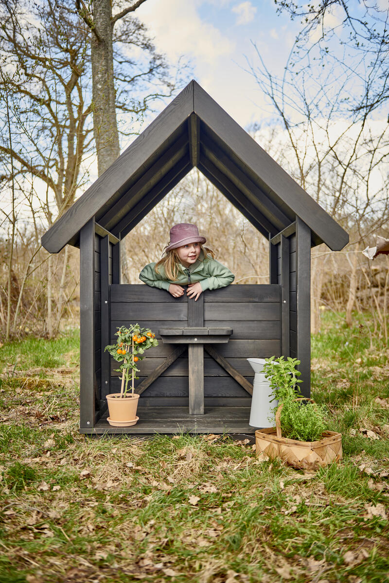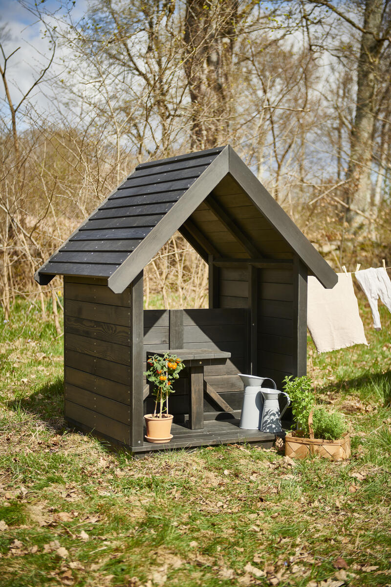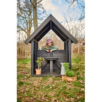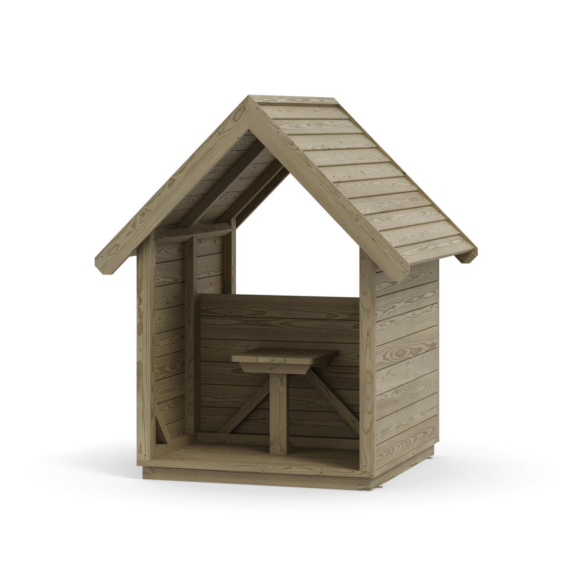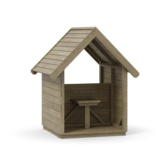 Ett mysigt och lättplacerat litet lekhus som lockar till lek. Lekhuset är inrett med ett litet bord på ena sidan, en halv avskiljningsvägg i mitten och en bänk på motsvarande sida. Avskiljningsväggen skapar möjlighet för barn som inte vill delta i rolleken att ändå känna en delaktighet och kan leka bredvid. Kortsidorna är helt öppna vilket ger pedagogerna en bra överblick, men även en möjlighet till avskärmning för barnen. Av massiv,PEFC-märkt furu. Mått: 128x145x171 cm. Levereras omonterat. Lösning för nedgrävd markförankring eller ytmontering väljs under tillval.