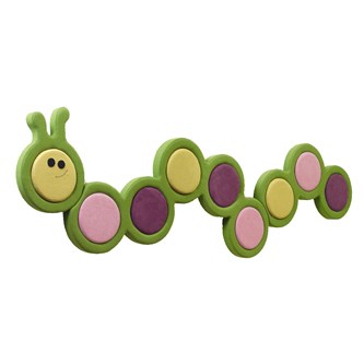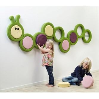 Larven med 6 sittdynor. Väggdekoration som även fungerar som ljudabsorbent. Ur larvens kropp kan barnen själva plocka sina sittdynor. Larven består av olika delar som kan monteras så att den ringlar sig upp och ner på väggen i olika former. Mått på sittkudde: ø 25 cm, tjocklek 6 cm. Tyg på sittkudde är avtagbart och tvättbart i 30 °C.