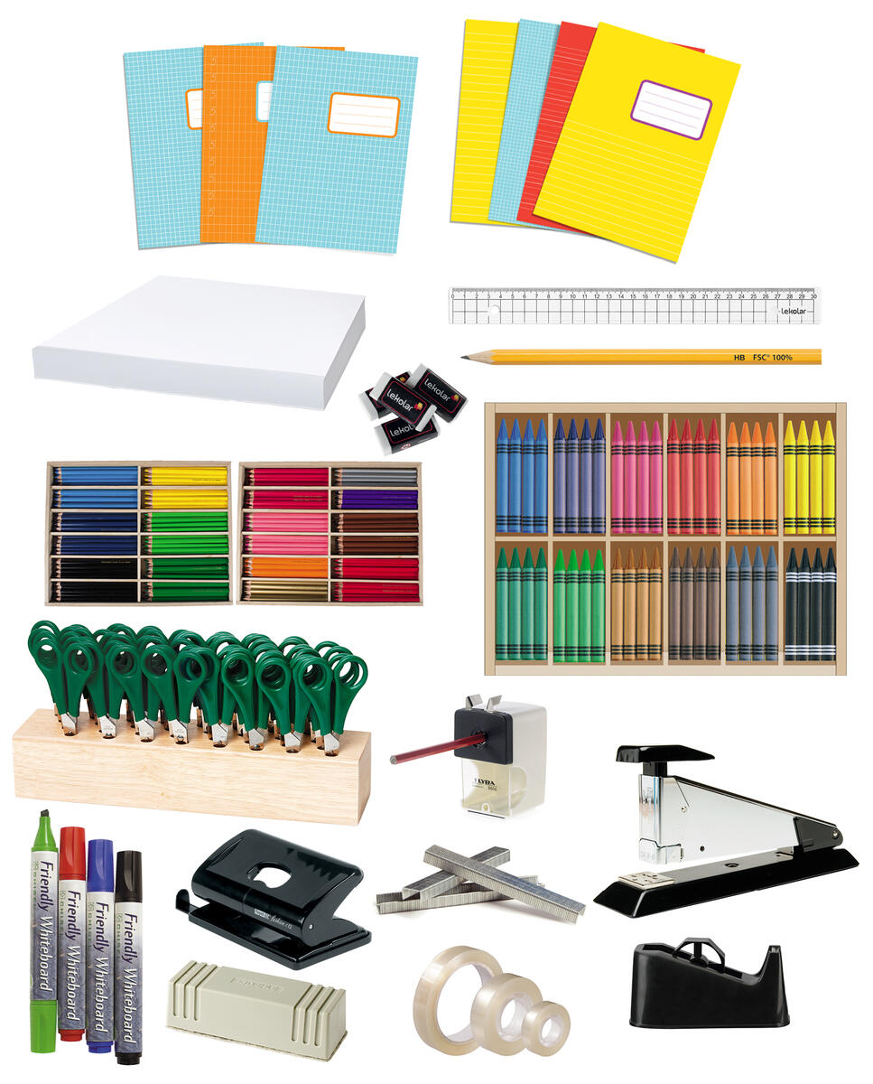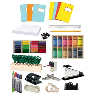 Här finns pennor, skrivböcker, linjaler, tejp med mera. Det räcker till ca. 30 elever. För att beställa hela paketet klickar du på köpknappen. I varukorgen kan du sedan ändra antal, ta bort eller lägga till vad du önskar. Allt finns hemma och levereras inom några dagar.