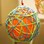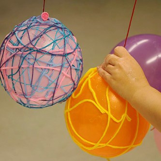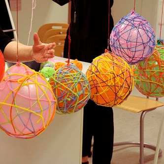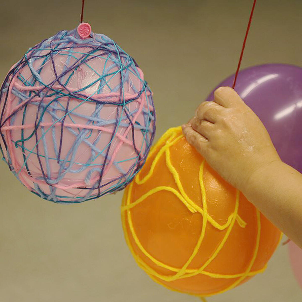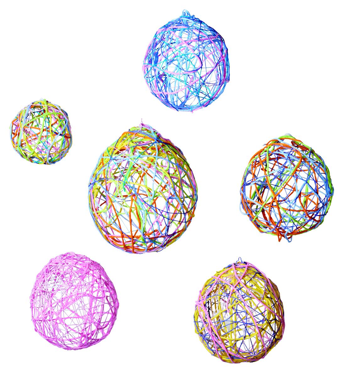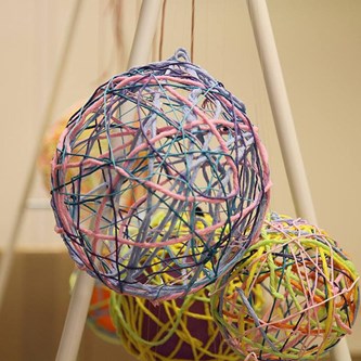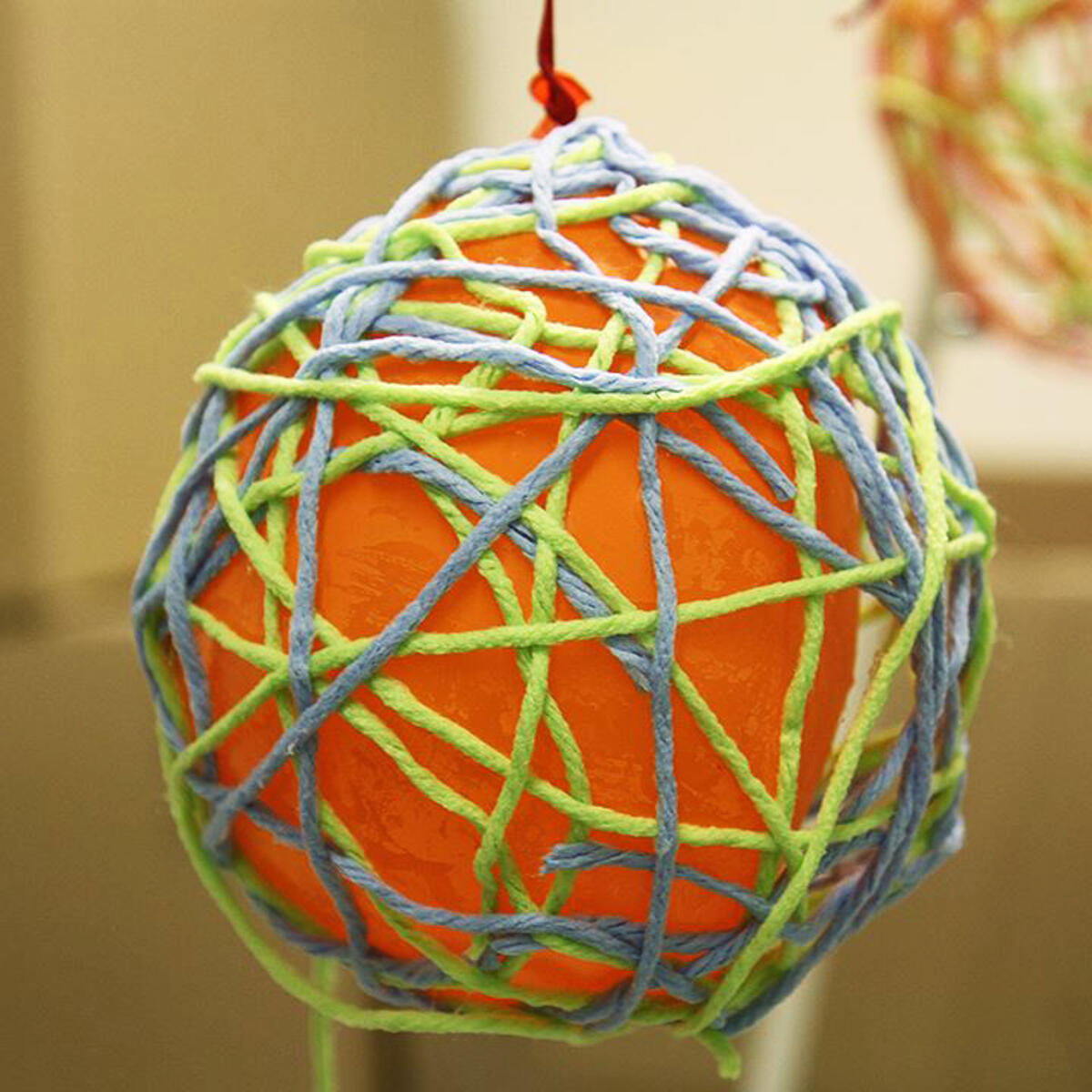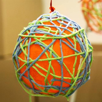 - Linda det kladdiga garnet runt ballongen. Fortsätt på samma sätt tills ballongen är så täckt som önskas i valda färger. Bäst resultat blir det om garnändarna kommer så nära en korsning som möjligt.