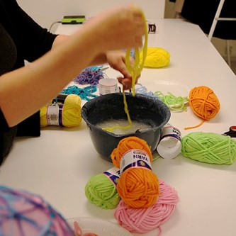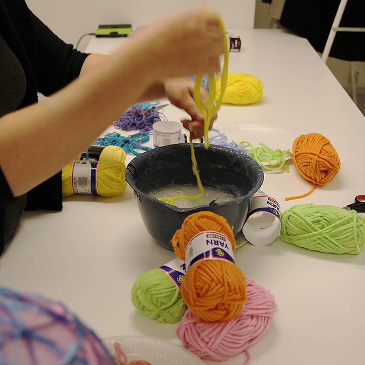 - Häll upp tapetklister på papptallrik eller en liten bricka. Klipp till en lång bit garn, lägg den i klistret och se till att hela garnbiten blir ordentligt inkletad med tapetklister.