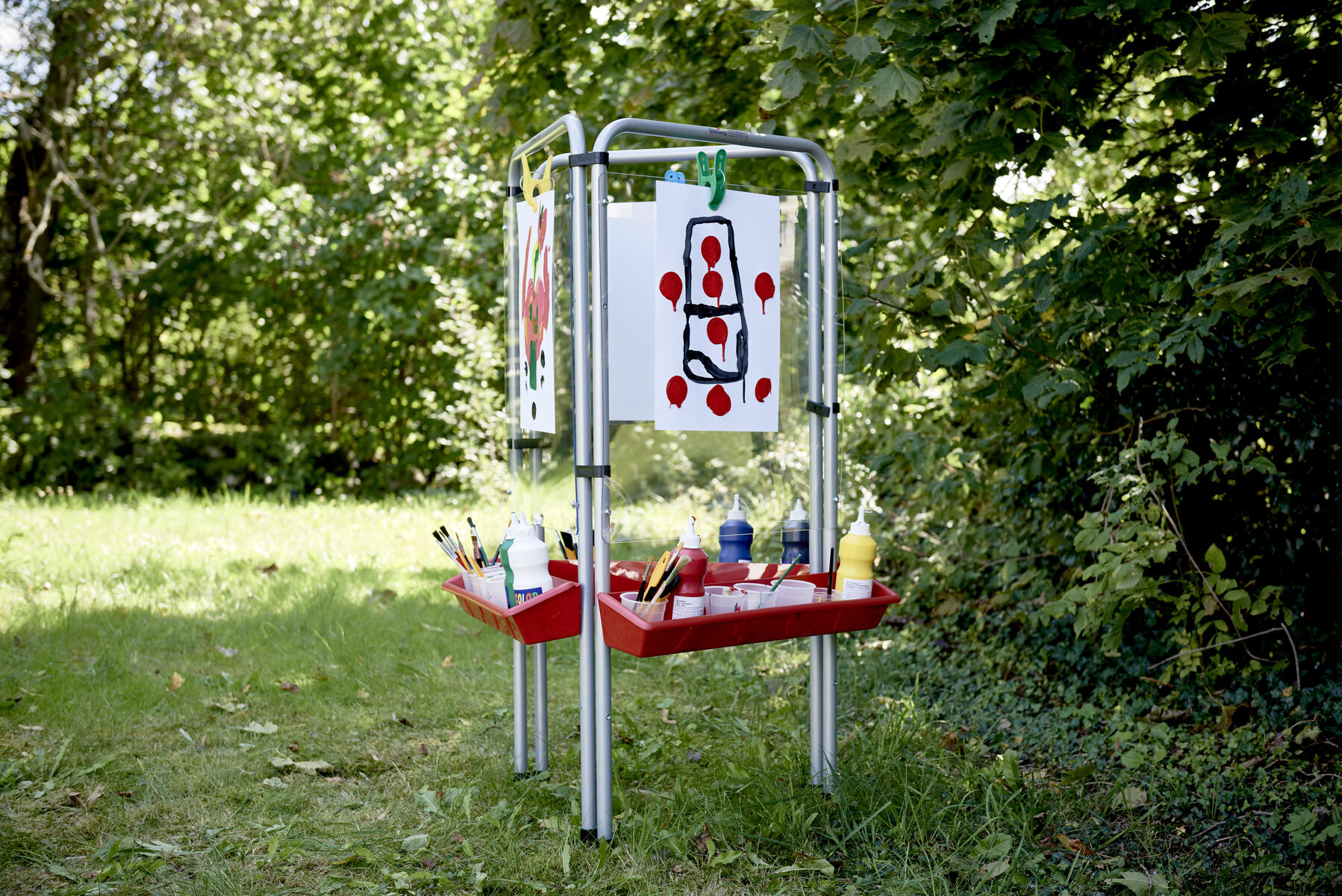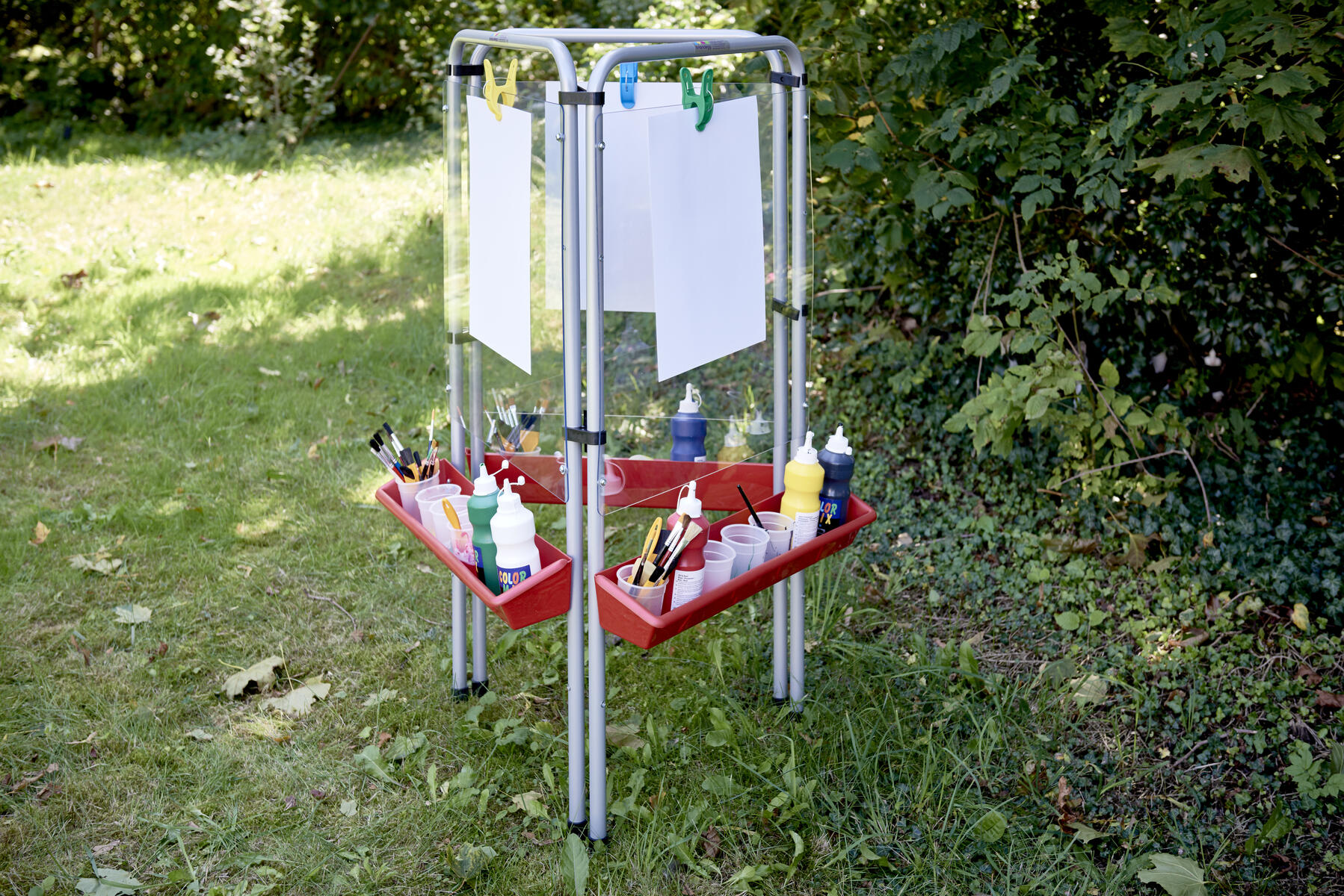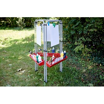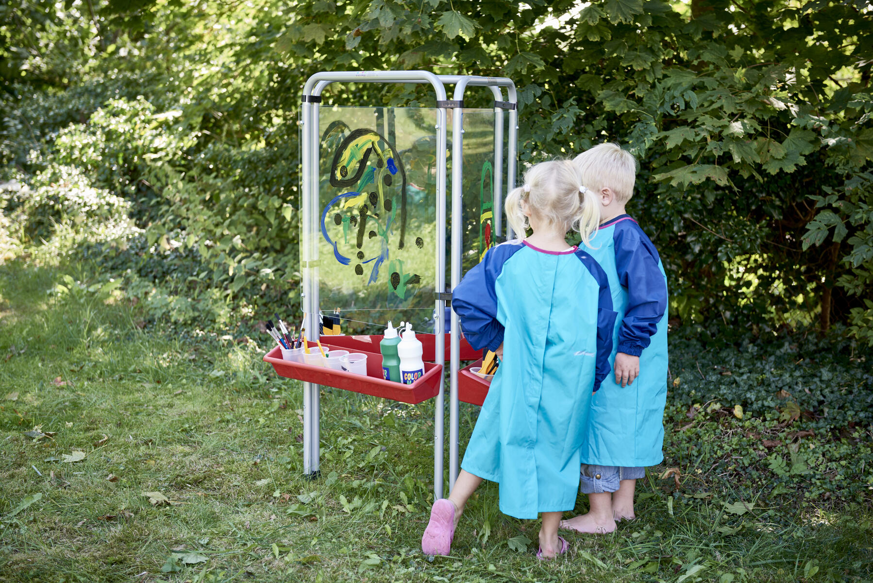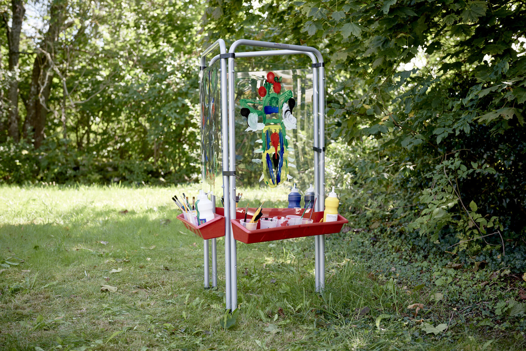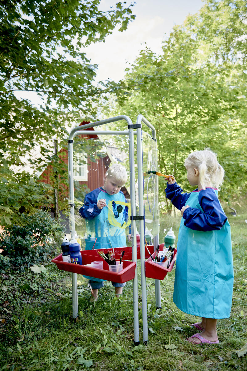 Lågt dubbelsidigt bordsstaffli för utomhusbruk. Lätt konstruktion med tåligt pulverlackat metallstativ i grått. De transparenta panelerna i A3-storlek är tillverkade av akrylplast och åtkomliga från två håll. Det går att måla direkt på panelerna med avtvättningsbar färg, t.ex. Colormix (41512). Låt barnen måla varandras porträtt direkt på panelen genom att stå på varsin sida och måla av. Stativet fälls ihop i sidan vid förvaring. Tänk på att gångjärn medför klämrisk. En sida mäter B58xH59 cm, hopfälld tjocklek 8 cm. Rengörs med milt rengöringsmedel och vatten. Följ alltid anvisningar för rengöring för den färg som används.