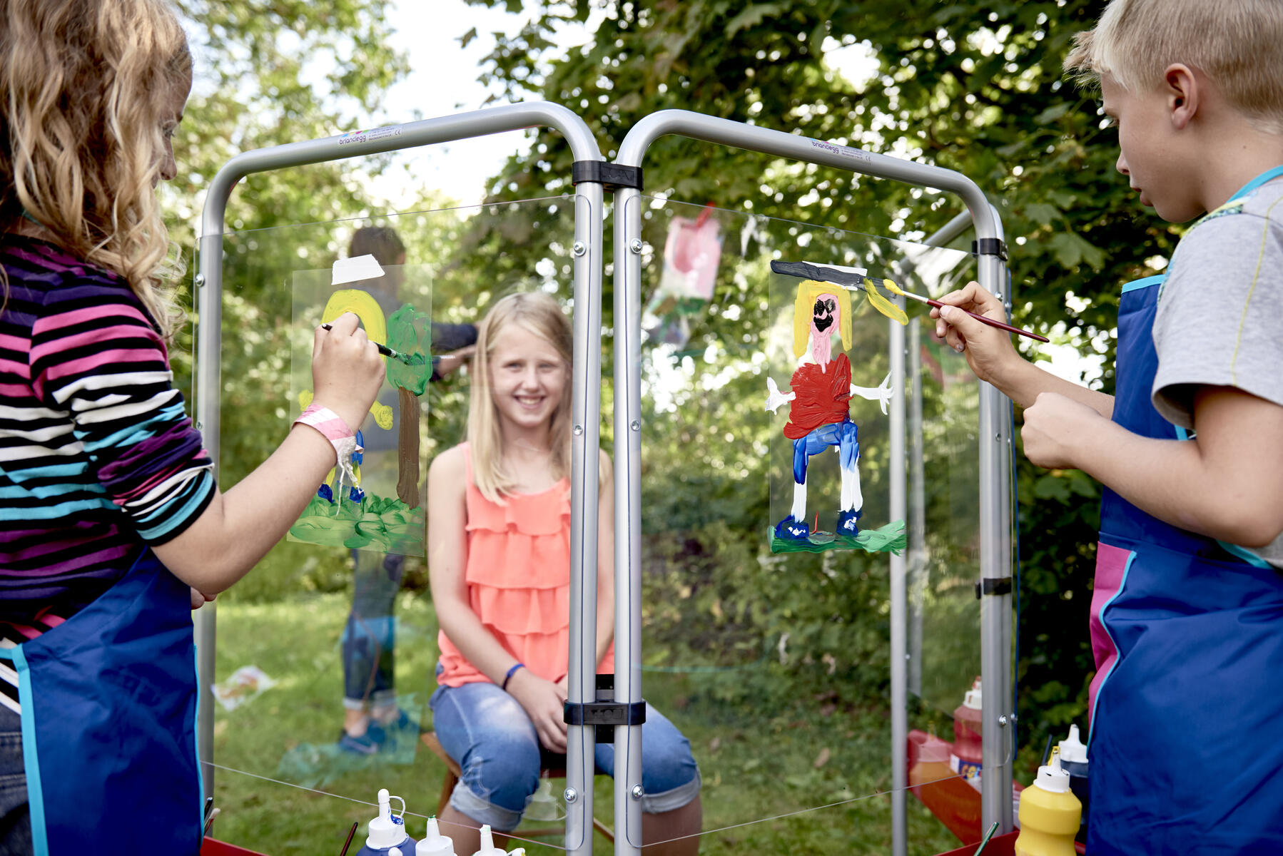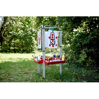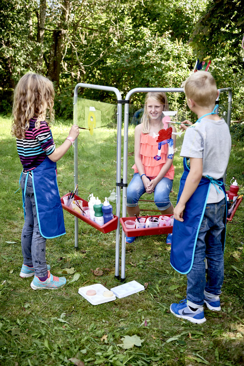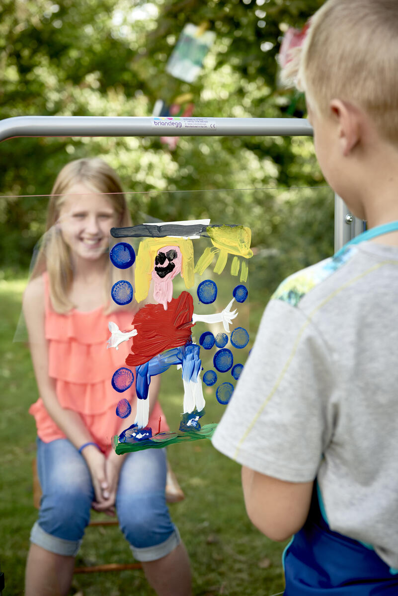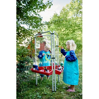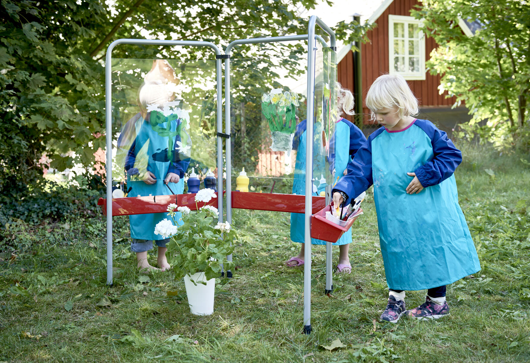 Lågt dubbelsidigt bordsstaffli för utomhusbruk. Lätt konstruktion med tåligt pulverlackat metallstativ i grått. De transparenta panelerna i A3-storlek är tillverkade av akrylplast och åtkomliga från två håll. Det går att måla direkt på panelerna med avtvättningsbar färg, t.ex. Colormix (41512). Låt barnen måla varandras porträtt direkt på panelen genom att stå på varsin sida och måla av. Stativet fälls ihop i sidan vid förvaring. Tänk på att gångjärn medför klämrisk. En sida mäter B58xH59 cm, hopfälld tjocklek 8 cm. Rengörs med milt rengöringsmedel och vatten. Följ alltid anvisningar för rengöring för den färg som används.