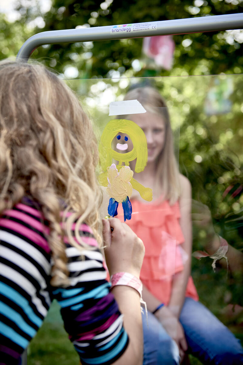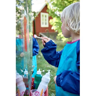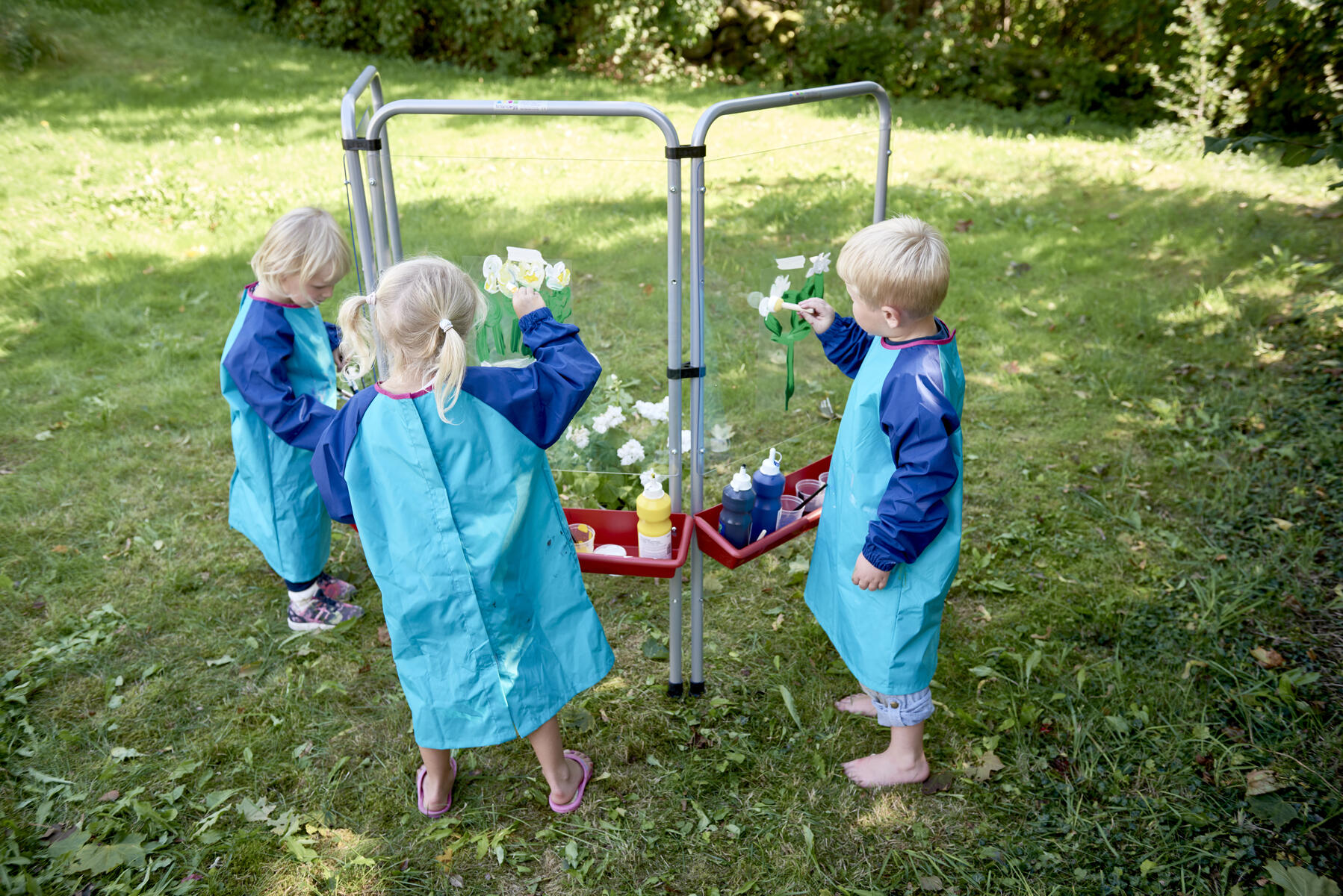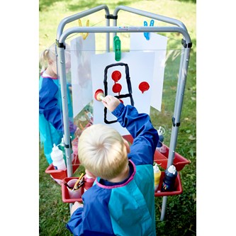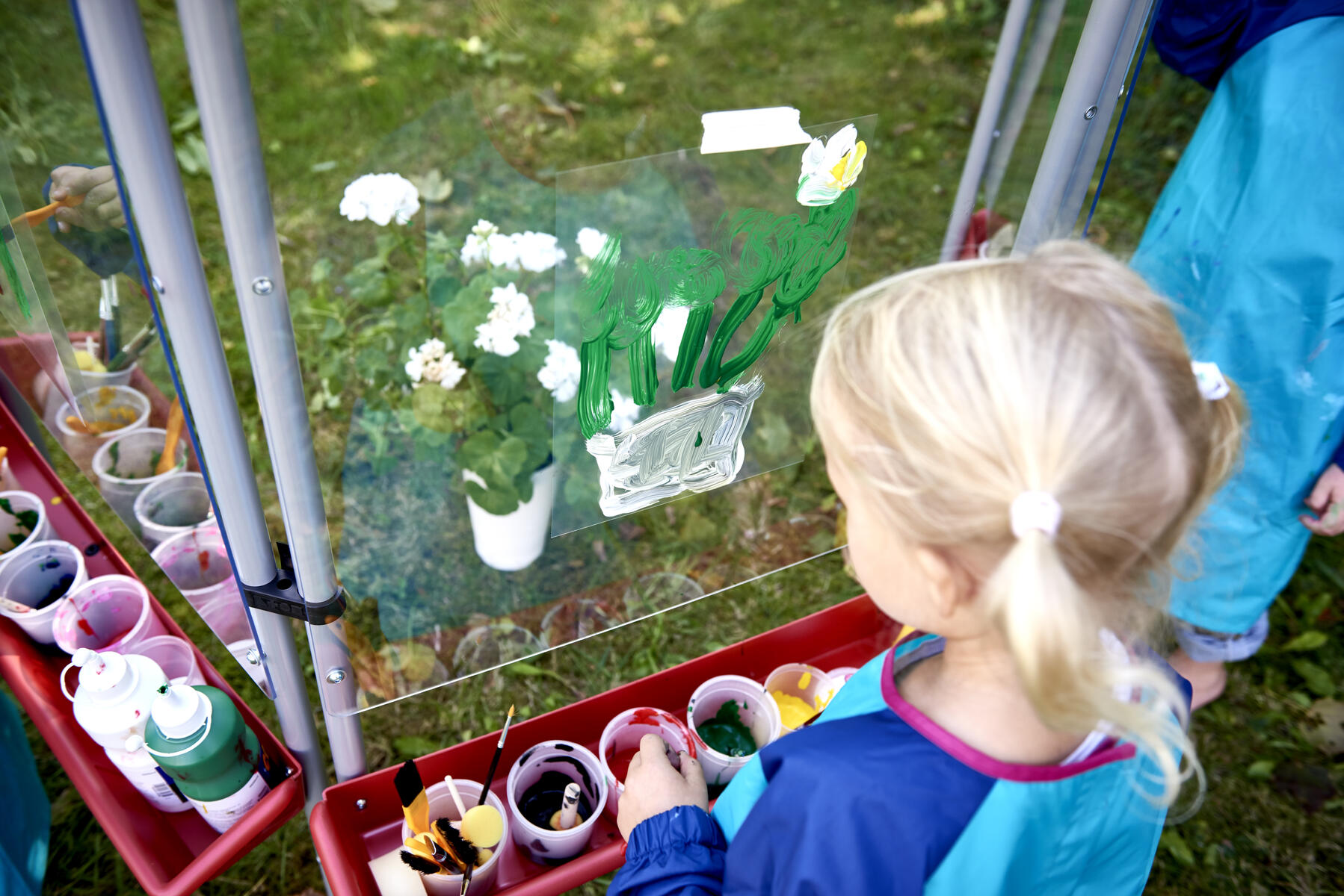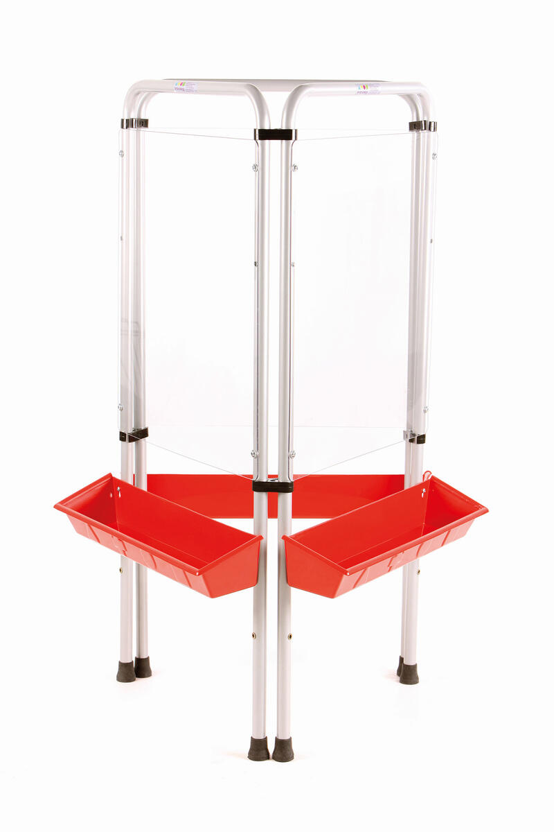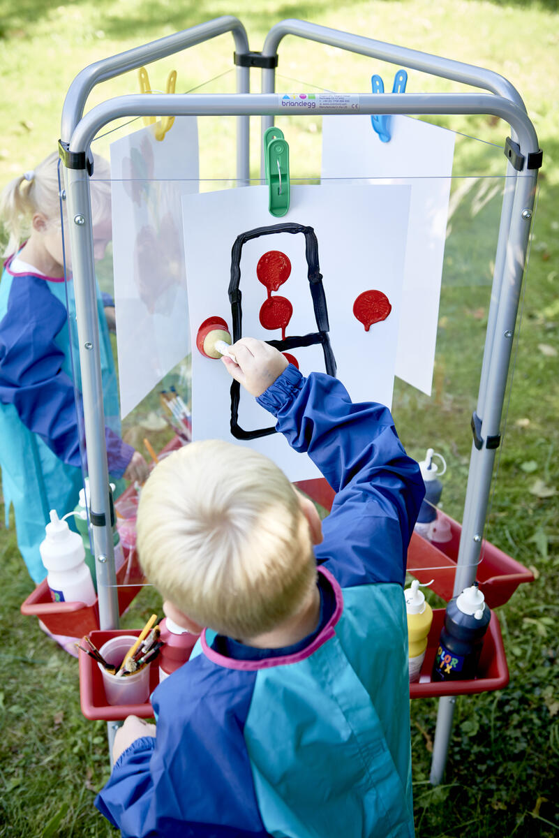 Lågt dubbelsidigt bordsstaffli för utomhusbruk. Lätt konstruktion med tåligt pulverlackat metallstativ i grått. De transparenta panelerna i A3-storlek är tillverkade av akrylplast och åtkomliga från två håll. Det går att måla direkt på panelerna med avtvättningsbar färg, t.ex. Colormix (41512). Låt barnen måla varandras porträtt direkt på panelen genom att stå på varsin sida och måla av. Stativet fälls ihop i sidan vid förvaring. Tänk på att gångjärn medför klämrisk. En sida mäter B58xH59 cm, hopfälld tjocklek 8 cm. Rengörs med milt rengöringsmedel och vatten. Följ alltid anvisningar för rengöring för den färg som används.