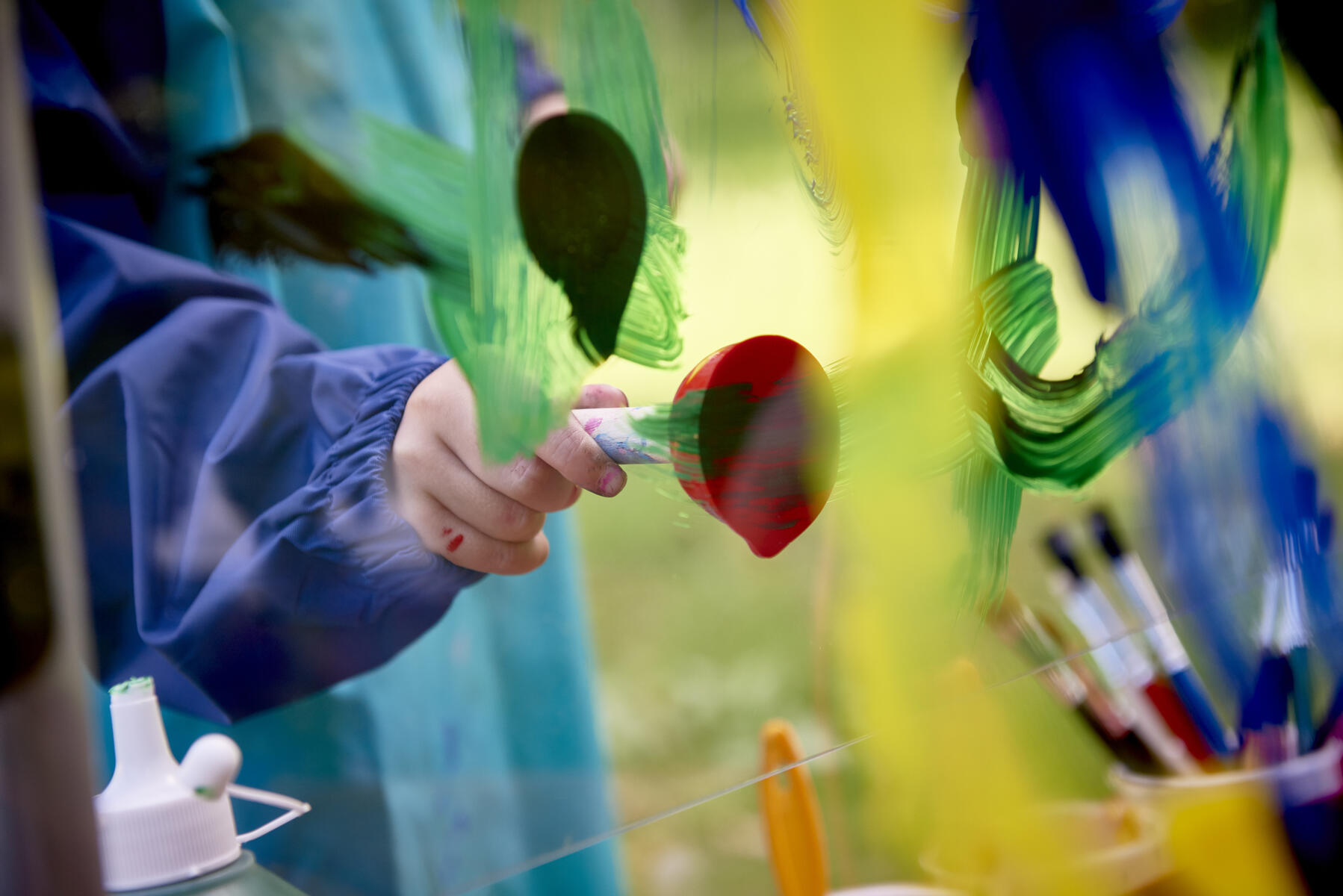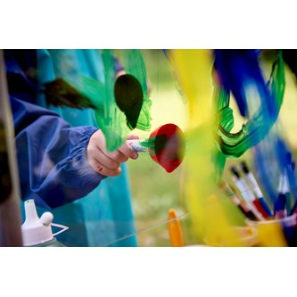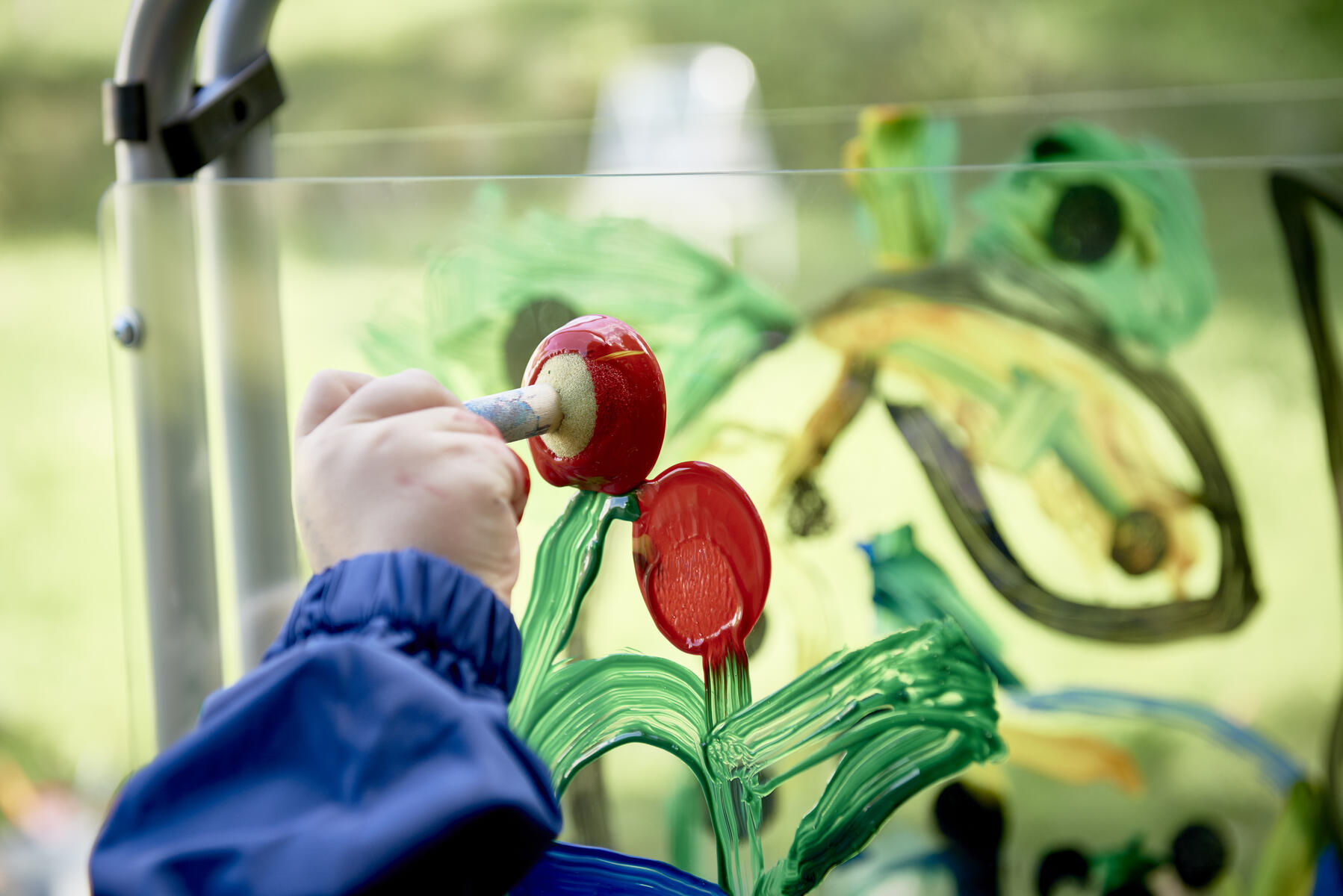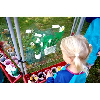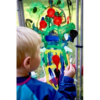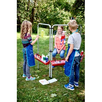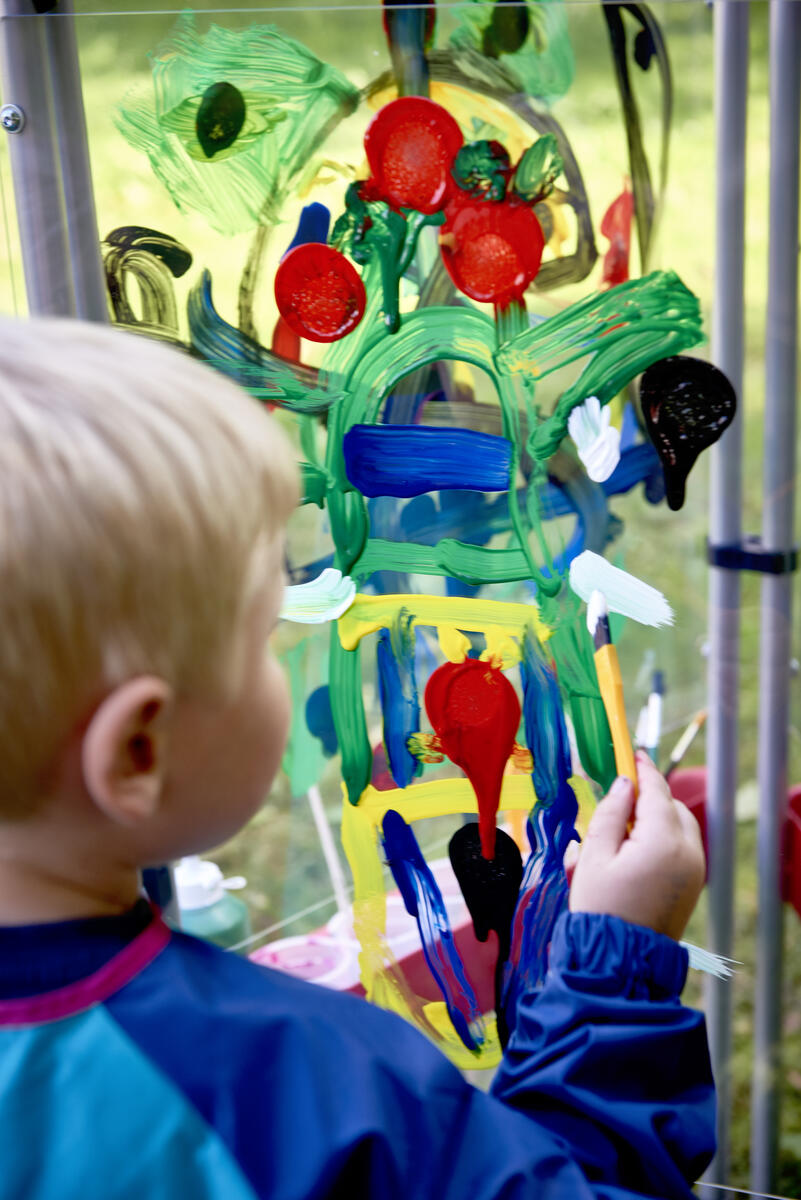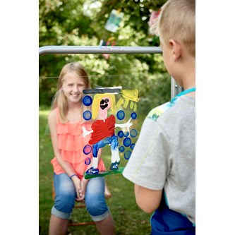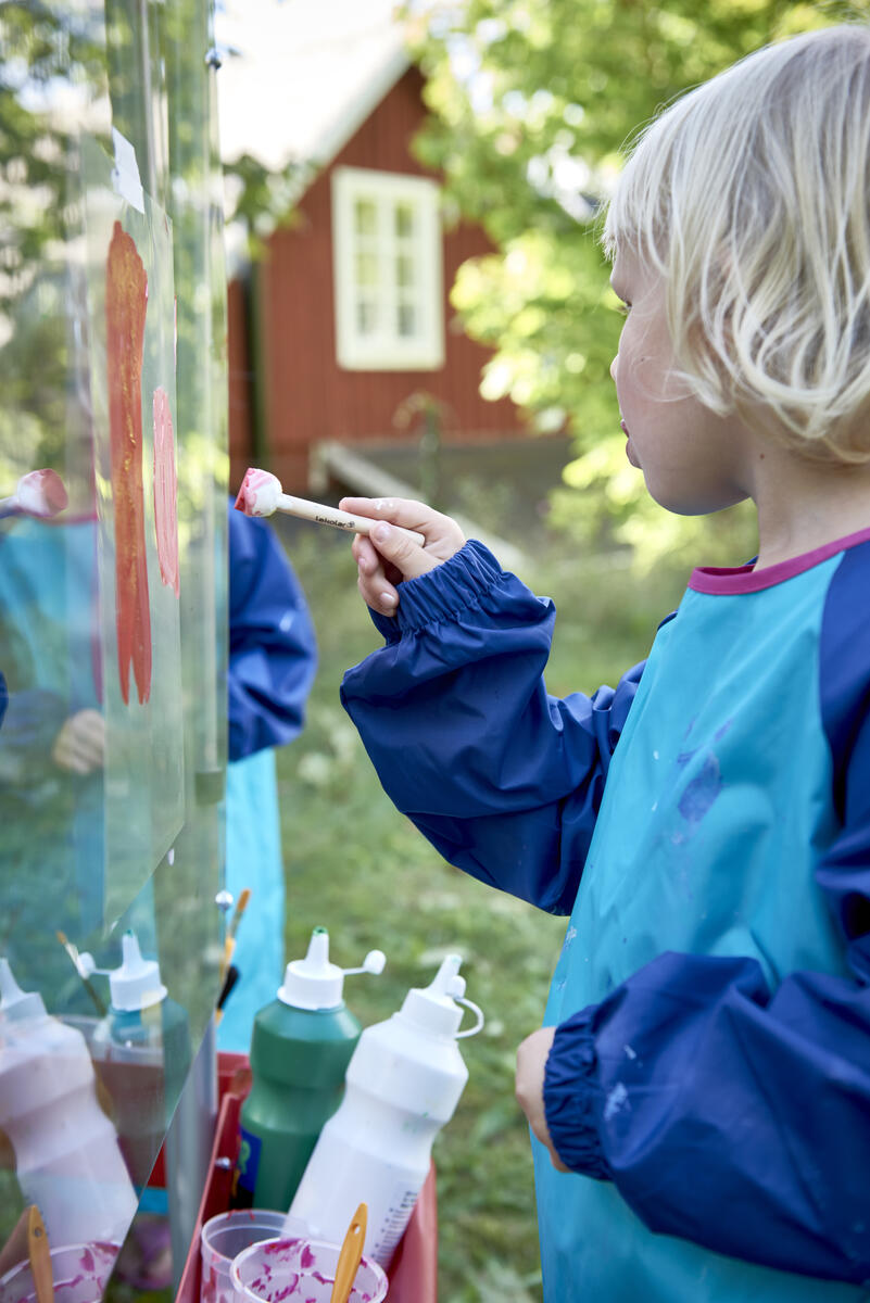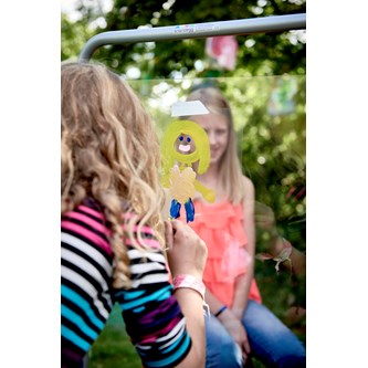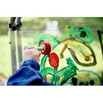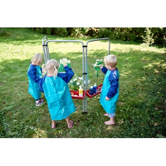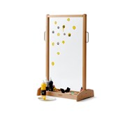 Lågt dubbelsidigt bordsstaffli för utomhusbruk. Lätt konstruktion med tåligt pulverlackat metallstativ i grått. De transparenta panelerna i A3-storlek är tillverkade av akrylplast och åtkomliga från två håll. Det går att måla direkt på panelerna med avtvättningsbar färg, t.ex. Colormix (41512). Låt barnen måla varandras porträtt direkt på panelen genom att stå på varsin sida och måla av. Stativet fälls ihop i sidan vid förvaring. Tänk på att gångjärn medför klämrisk. En sida mäter B58xH59 cm, hopfälld tjocklek 8 cm. Rengörs med milt rengöringsmedel och vatten. Följ alltid anvisningar för rengöring för den färg som används.