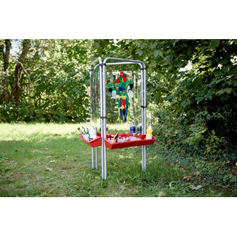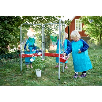 Stadig och flyttbar konstruktion för utomhusbruk. Transparenta paneler i akrylplast som fungerar för både tejp och plastclips. Panelerna är 60x60 cm och kan justeras i höjd. Förvaringshyllor, plastkoppar med lock samt plastclips medföljer. Höjd 120 cm. Levereras omonterat. Monteringsanvisning medföljer. Tillverkat av träskyddsbehandlad FSC-märkt furu. PVC-fri.