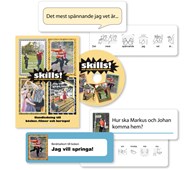 I fyra kortfilmer kan vi följa alla ungdomarna från böckerna i serien Skills. Alice, Maja, Ron, Jasmine, Markus, Johan, Pierre och Amanda tar med oss på sina fritidsaktiviteter. Två kortmaterial, berättarkort och samtalskort, ingår också och skapar tillsammans ett material som inspirerar till samtal och eget berättande. I filmerna "spelar" ungdomarna upp böckernas innehåll samtidigt som en berättare läser och tecknar böckernas handling. I bildrutan visas både själva filmen och den tecknande berättaren. Filmerna används som ett komplement till böckerna. Berättarkorten innehåller bilderna från de fyra böckerna i serien Skills. På baksidan av korten finns text kompletterad med teckenillustrationer. Korten används till att lägga historien i ordning och självständigt berätta om innehållet. Korten ger stort utrymme för samtal kring en berättelses röda tråd, om inledning och avslut, om miljöer och känslor. Samtalskorten består av olika startmeningar för att stimulera till samtal om till exempel egna aktiviteter, önskemål och fritidssysselsättningar. Dra ett kort ur leken och låt startmeningen på kortet bli inledningen till ett samtal. Ett utmärkt material för att träna reflektion och för att ge uttryck för självständiga tankar och drömmar. Annika Rehn som skrivit de populära böckerna om Ebba är nu tillbaka med Skills, en bokserie om ungdomar för ungdomar. Till sin hjälp har hon även denna gång fotograf Göran Gilleson. Med materialet Skills vill de locka till kommunikation. Skills omfattar fyra böcker, korta filmer och två kortmaterial. Allt handlar om fritidsaktiviteter och innehållet ger många tillfällen till samtal och tankar och förhoppningen är också att inspirera ungdomar till ett eget berättande. Hela materialet har stöd av tecken. DVD, längd ca 20 min, 44 berättarkort, 32 samtalskort. Materialet levereras i en praktisk ask.