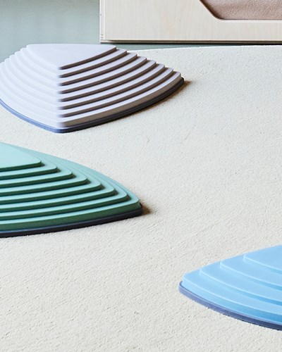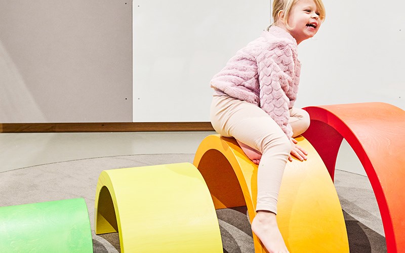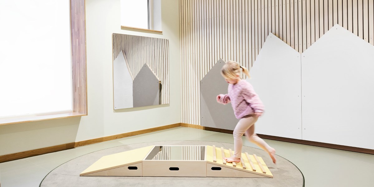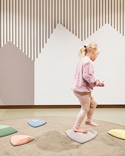 I aktivitetsrummen är det fokus på rörelse och motorisk träning. Här kan barnen öva balansen på både lekvalvet i regnbågsfärger, balansstenarna och ramperna. Barnen bjuds också in till att skapa hinderbanor med de olika produkterna och kan tillsammans hjälpas åt att skapa en bana.