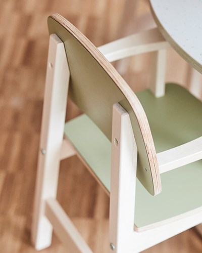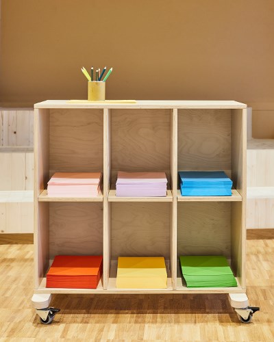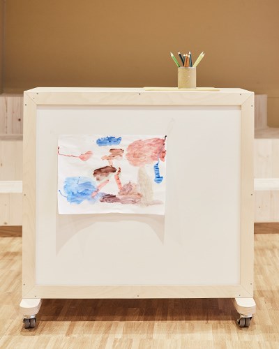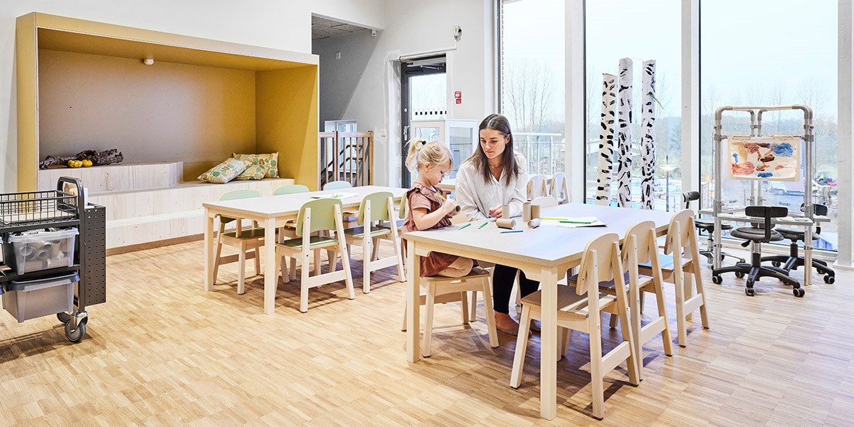I ateljén finns det plats för kreativitet i alla dess former. Rummets höga takhöjd och rymliga lokal i jordnära färger skapar bra förutsättningar för kreativiteten att flöda. Här finns olika typer av zoner för olika typer av skapande. Barnen kan med fördel kladda på bord Maria som har en yta i linoleum som både ljuddämpar och tål väta. Även här, likt i matsalen, hittar vi barnstol Helmi och åkstol Palett. För de barn som vill stå och måla har vi placerat två stafflier med plexiglas men även två väggstafflier. Det finns dessutom gott om förvaring för allt skapandematerial. Förutom förskolans egna fasta förvaring finns den mobila i form av Wille-vagnen och Fixa-stommen med öppna fack och whiteboard.