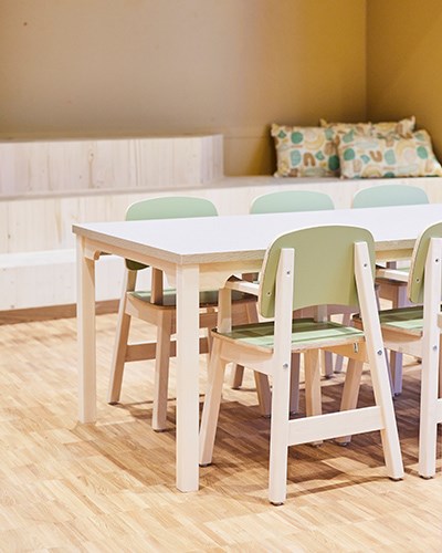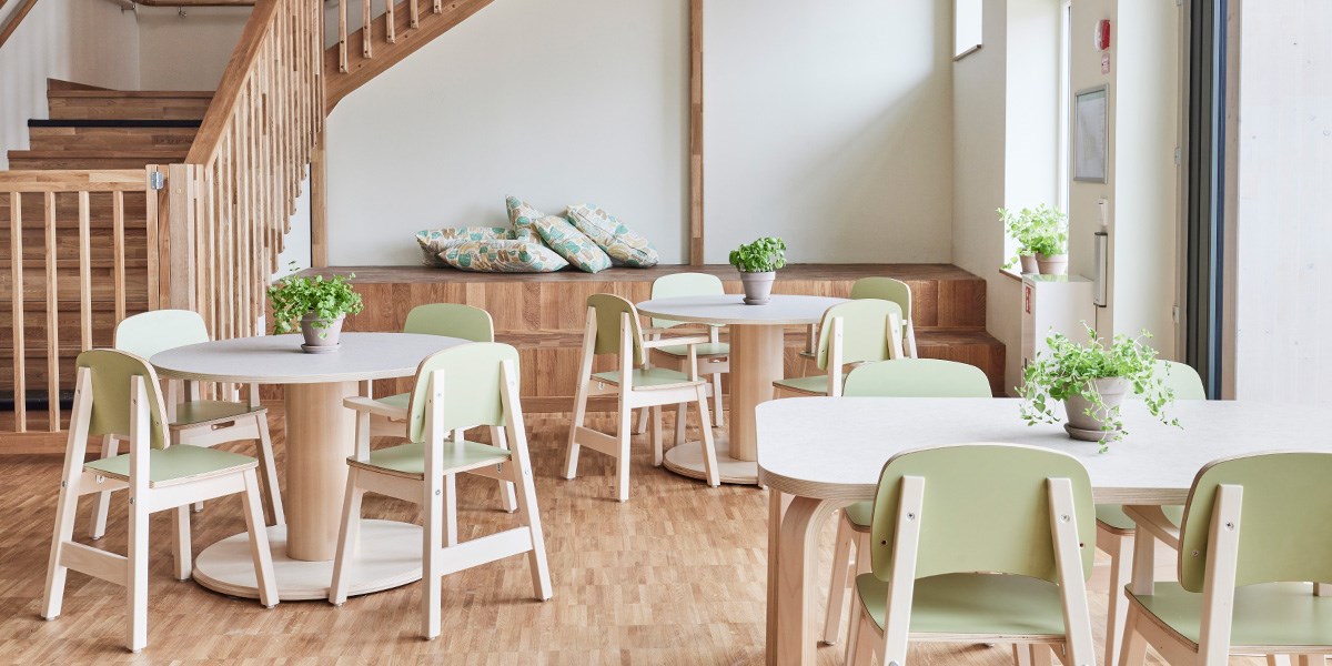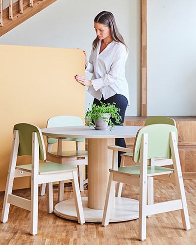Vad blir det för mat? I förskolans restaurang och matsal har vi möblerat för att skapa en miljö där barnen och pedagoger ska få en härlig matupplevelse. Här finns en variation av både runda och rektangulära bord för att skapa en fin balans. Barnen sitter skönt på barnstol Helmi och i rummet finns smidiga åkstolar för pedagogerna. Avskärmning och ljuddämpning skapas enkelt med våra flyttbara golvskärmar Enkel.