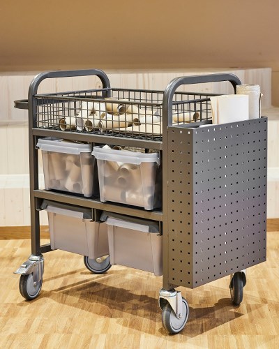 På den översta bilden syns Norden materialskåp med sällskap av våra praktiska vägghängda Fixa whiteboards och anslagstavlor. Mattan kan med fördel användas för både samling framför whiteboarden liksom pedagogisk lek. På mattan står förvarings- och lekmöbeln Fixa svängd och bredvid syns vårt låga Playwood lekbord med Fixa lekmatta. Ytterligare förvaring finns tack vare våra Fixa stommar med hjul. Möbleringen längst bak med bord och stolar är från vår serie Lilla My och den främre möbleringen utgörs av barnstol Helmi och ett specialtillverkat bord (kontakta kundtjänst för mer information).