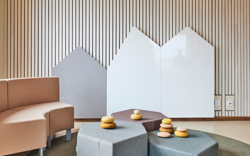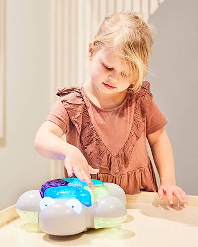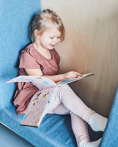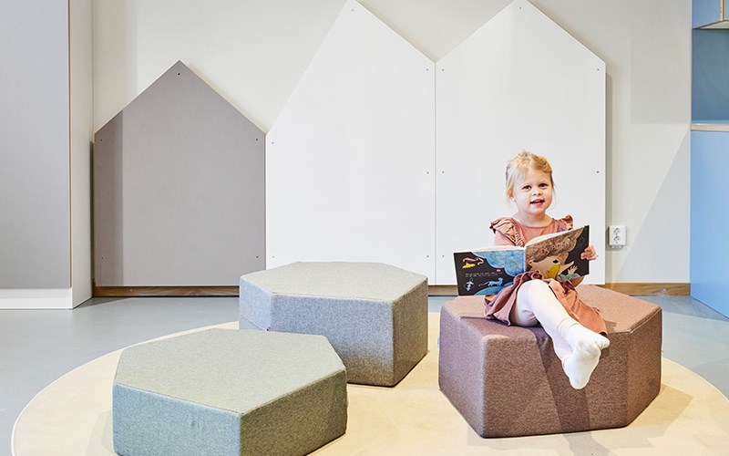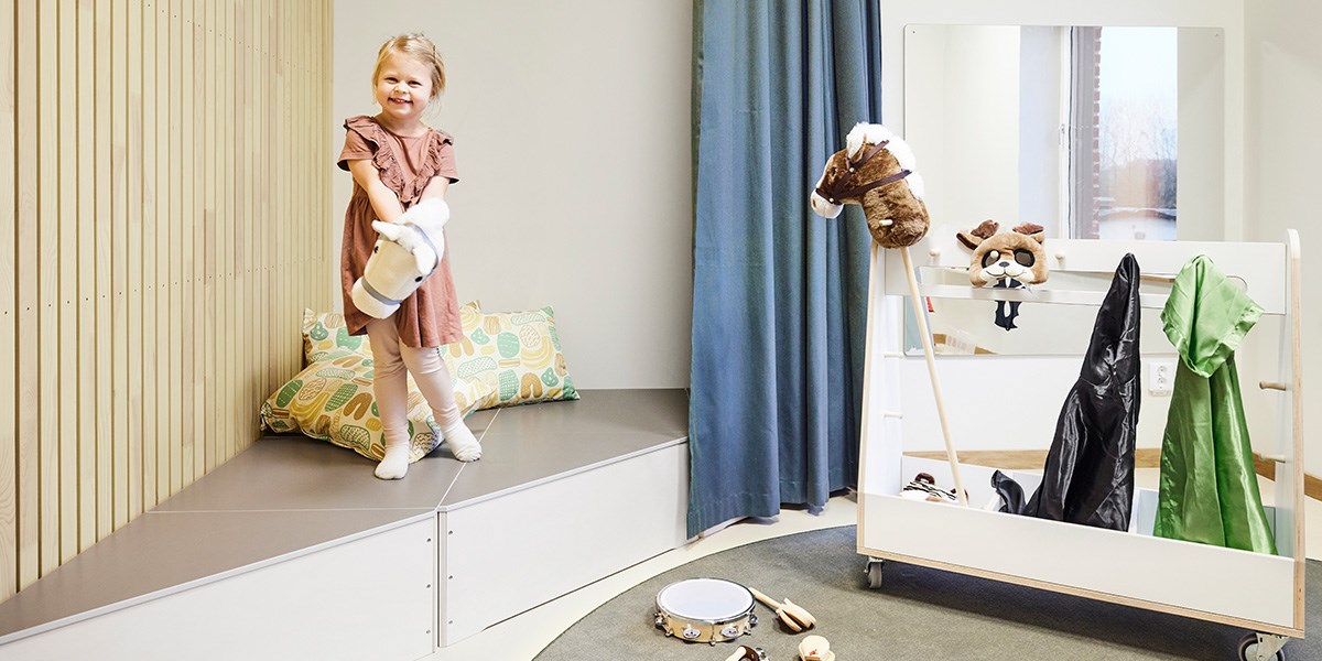 Den lilla möbleringen med hjälp av barnstol och bord Lilla My möjliggör allt från läsning till pusslande eller lek med färgklossar. Med hjälp av lekbordet kan pedagogerna förvara leksaker och lärmaterial och barnen kan förundras av allt från green screen till programmering med Glow and Go Bot. Ett av grupprummen har dessutom gjorts om till ett rum för utklädnad och rollek. På utklädningsvagnen kan barnen välja kläder för att sedan uppträda på den riktiga scenen med draperier som går att dra fram och tillbaka likt en ridå. För att skapa scenen har vi använt våra Art scenmoduler och på scenen ligger ett gäng Hodgepodge-kuddar. Rummet kan fyllas med allt från rytmikinstrument till käpphästar, sagokappor och djurmasker.