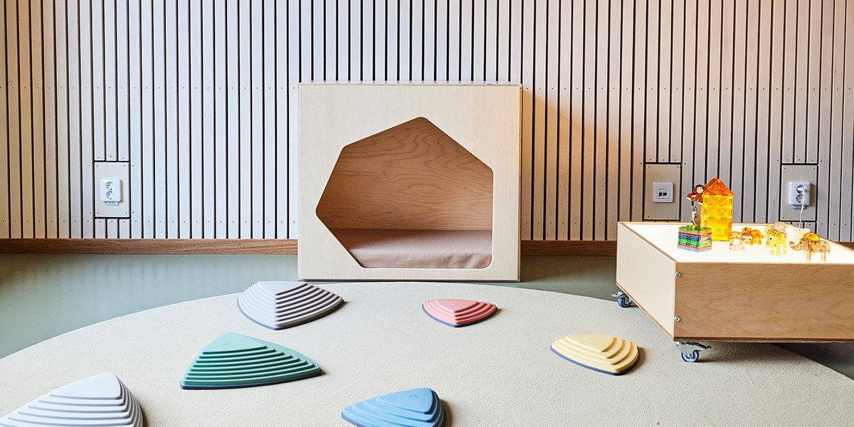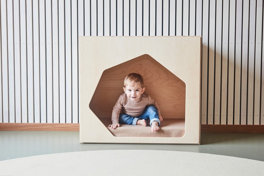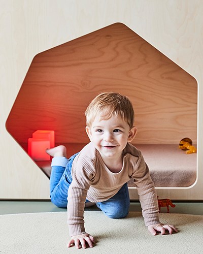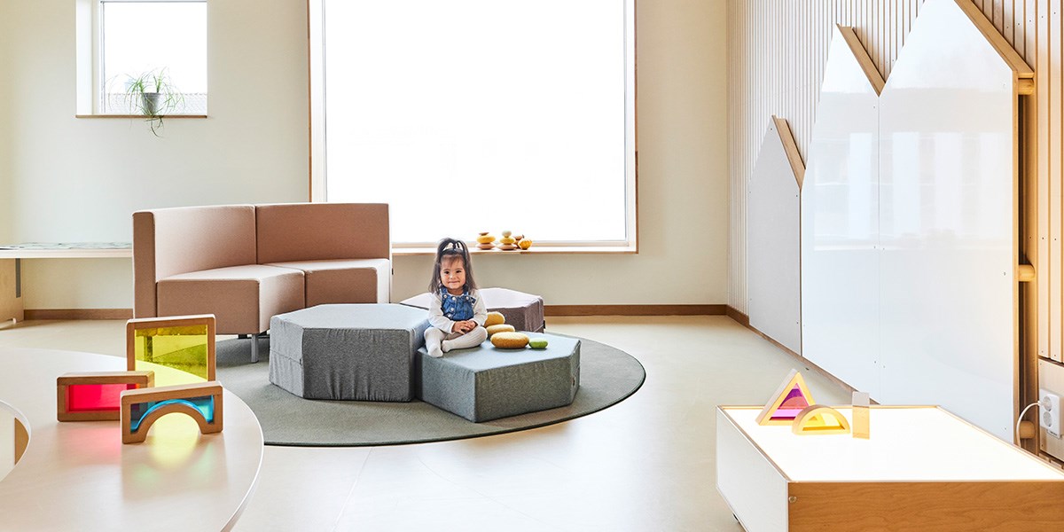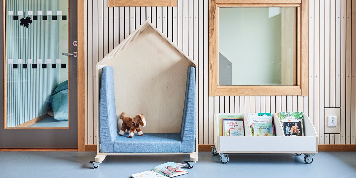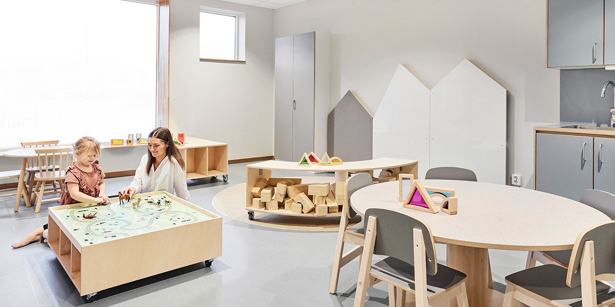 I detta basrum finns det plats för att samlas, leka och utforska, både själv och tillsammans med andra. Här har vi möblerat med låga möbler och grupperingar för en god överblick över rummet samt flexibilitet i att skapa nya rum eftersom flera av möblerna har hjul. Detta gör även att man enkelt kan avskärma eller rama in.