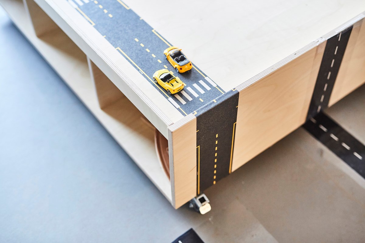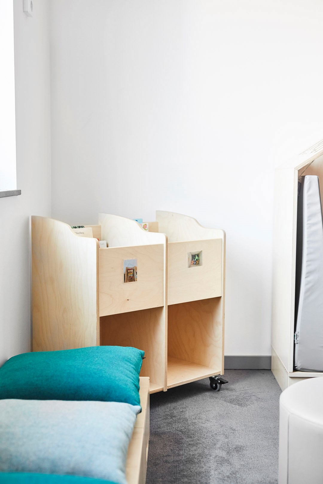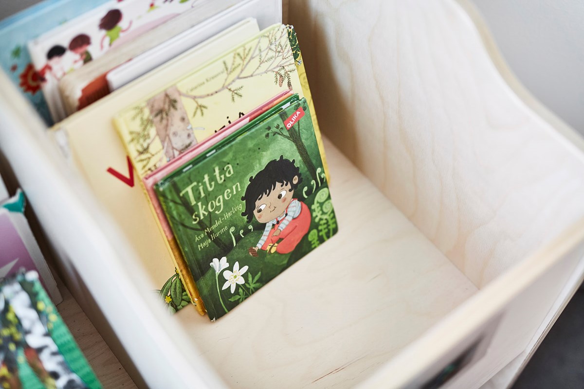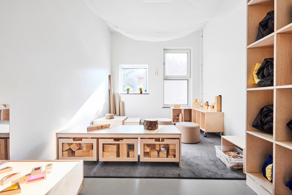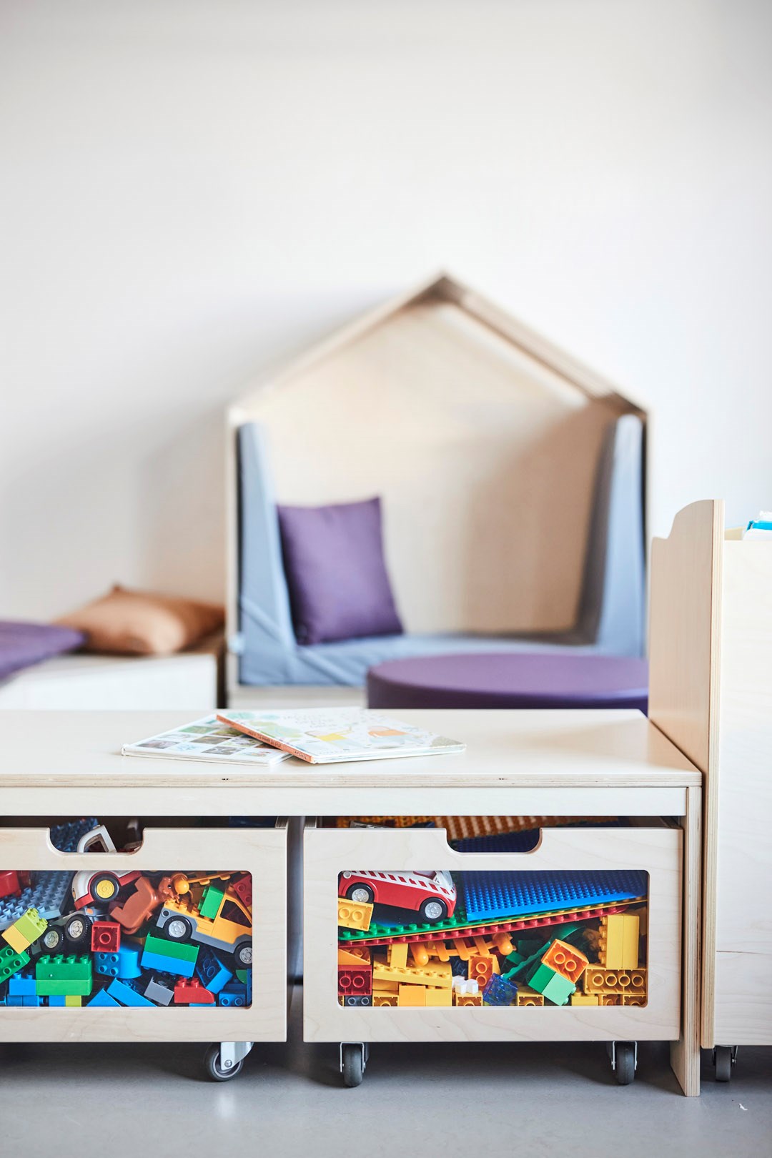 I det inbjudande lekrummet finns bygg- och lekmaterialet lättillgängligt och nära till hands i låg förvaring. Fixa bänk har till exempel plexiglasbackar som gör det lätt för barnen att se vad som finns i lådorna.