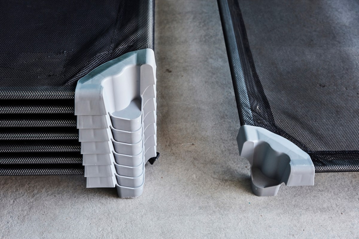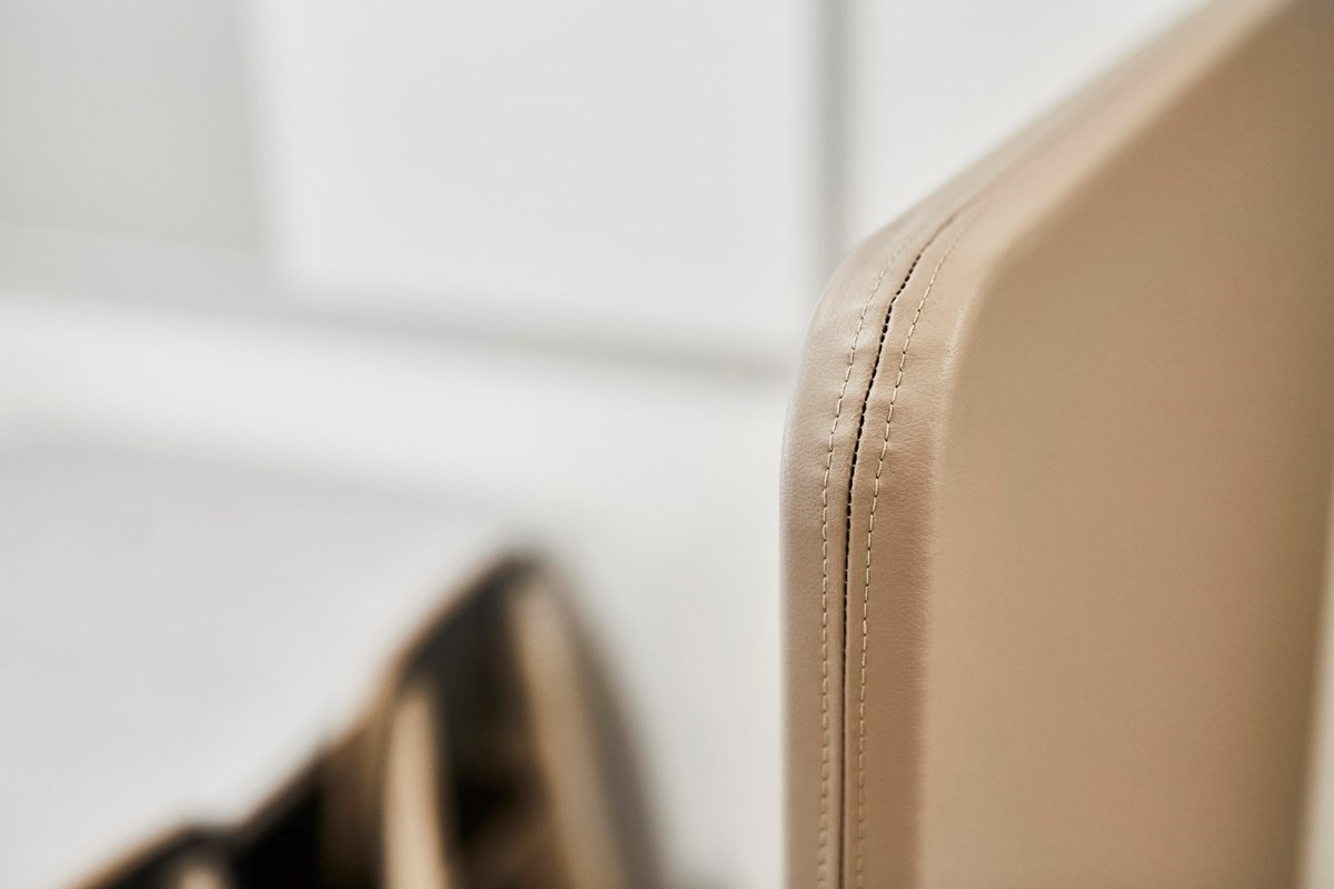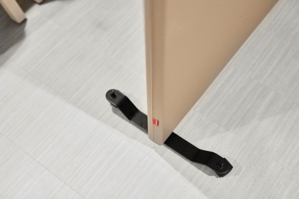 Matsalens ljudabsorberande skärmväggar Enkel är klädda med det lättskötta och Oeko-tex-certifierade tyget PUxx - ett mjukt och behagligt konstläder som kan rengöras med 70 % alkohollösning utan att behöva eftertorkas med vatten.