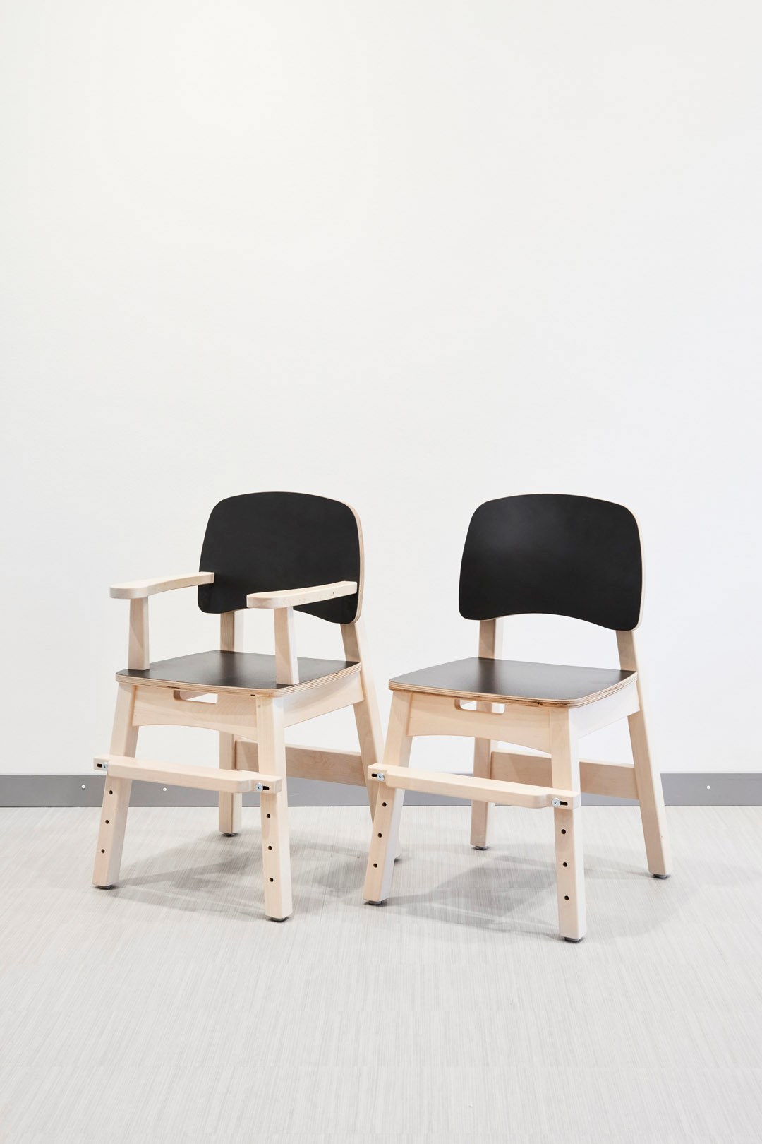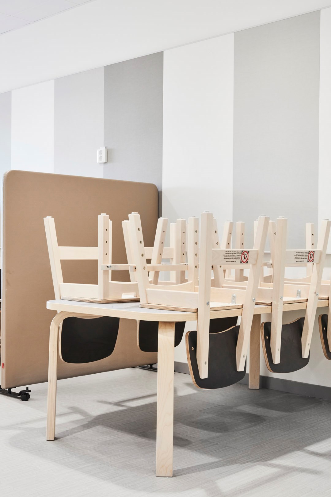 Möblerna som använts i förskolans matsal är bord Rabo i höjd 60 cm, golvskärm Enkel, rullpall Micro och barnstol Helmi i höjd 37. (Helmi går även att få i specialutförande med fotstöd, som på bilden.)