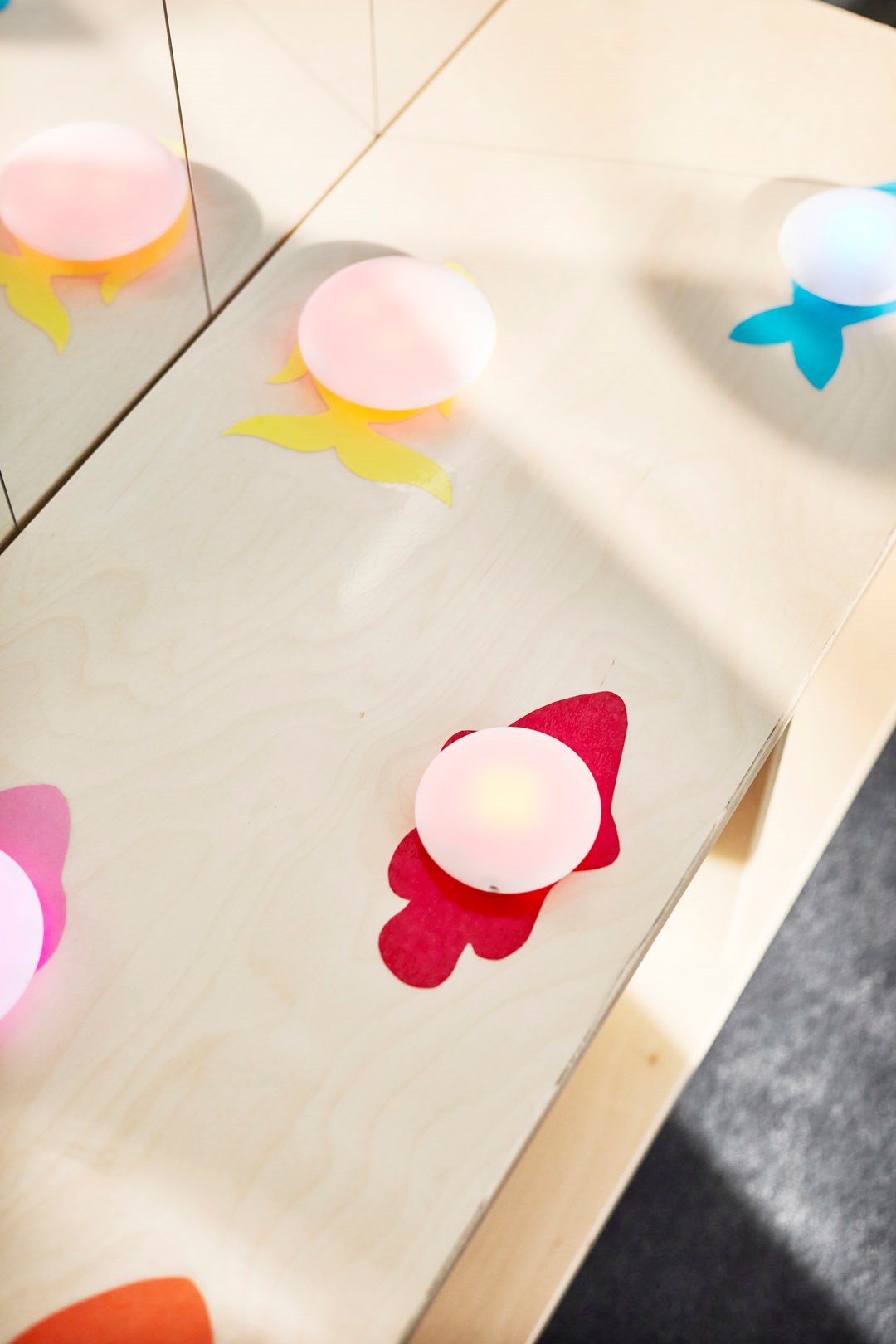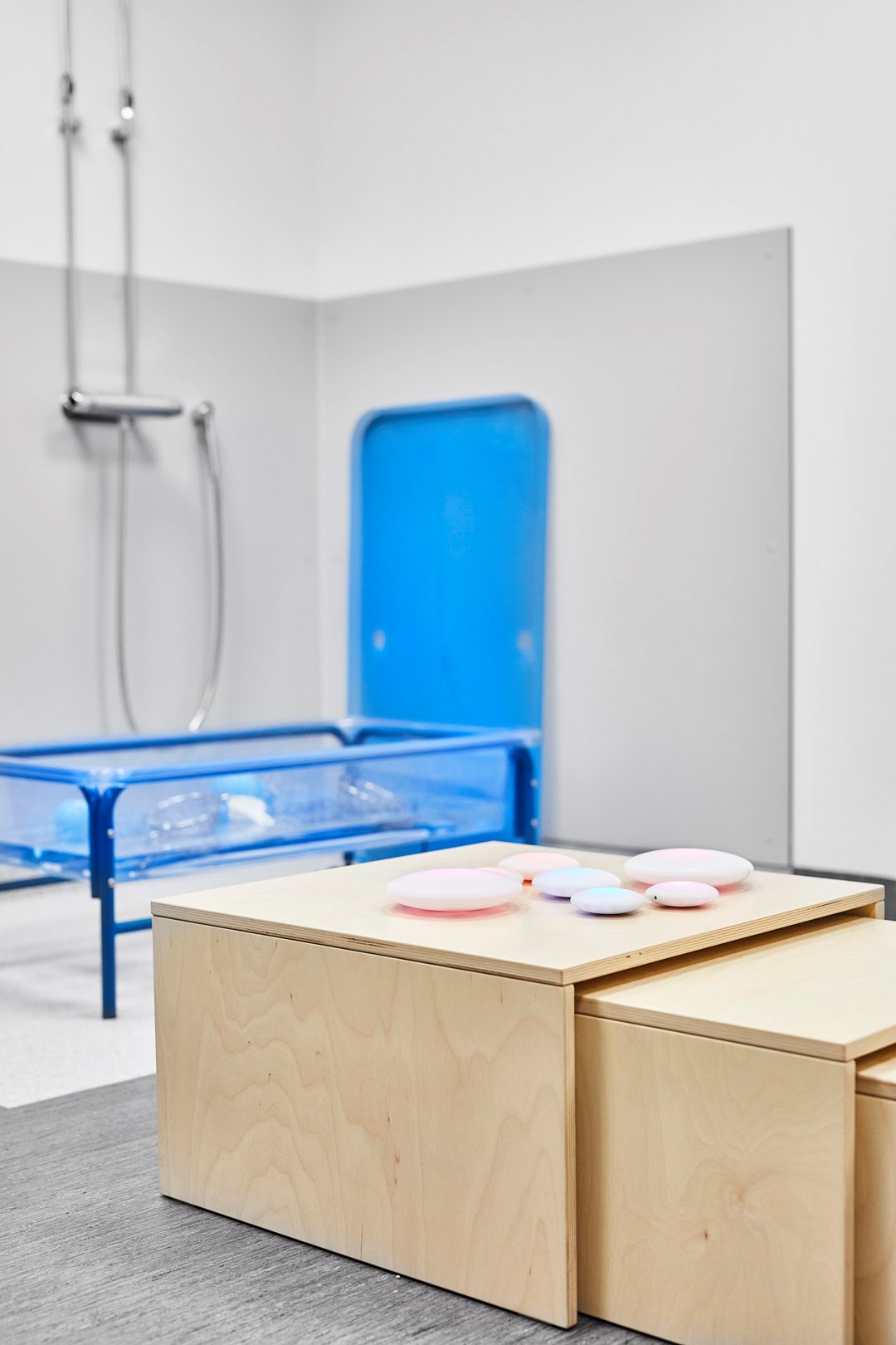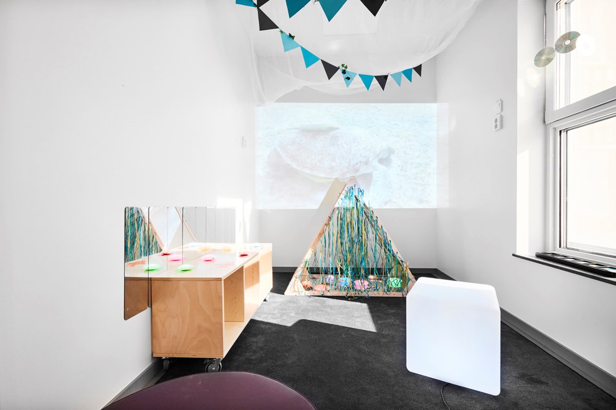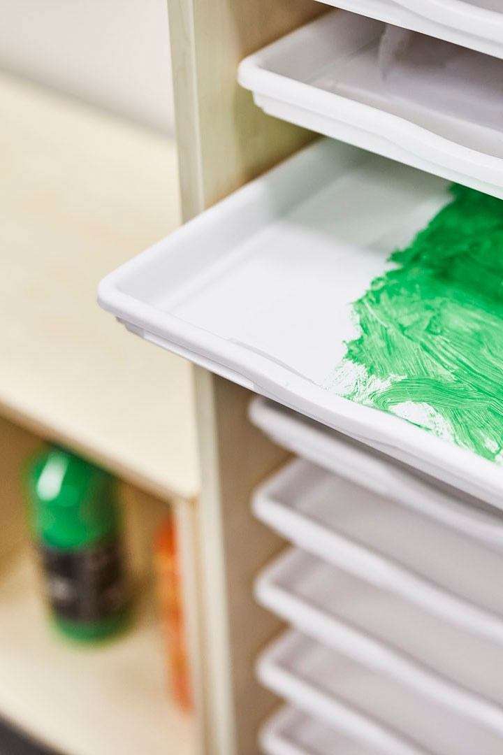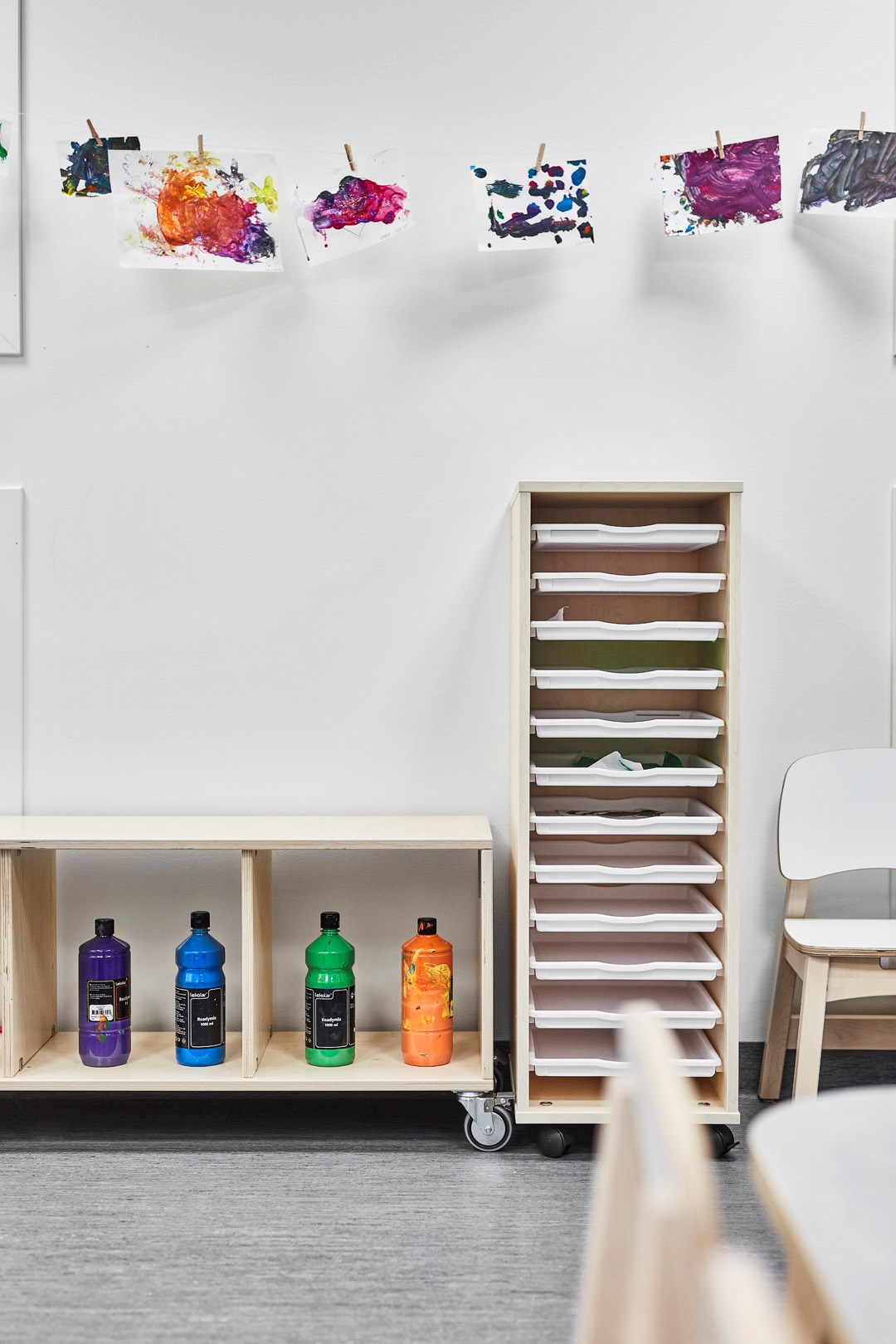 I förskolans ateljé får barnen skapa och utforska och här finns ett populärt sand- och vattenlekbord. Podiet Tryggve är en perfekt avställnings- eller sittyta, men fungerar också såom en rolig tunnel för de minsta barnen.