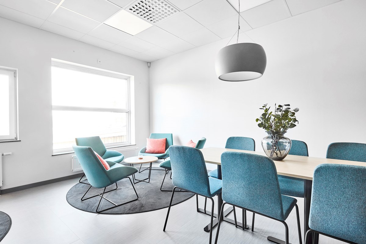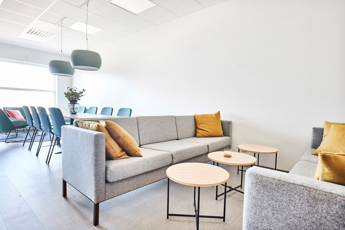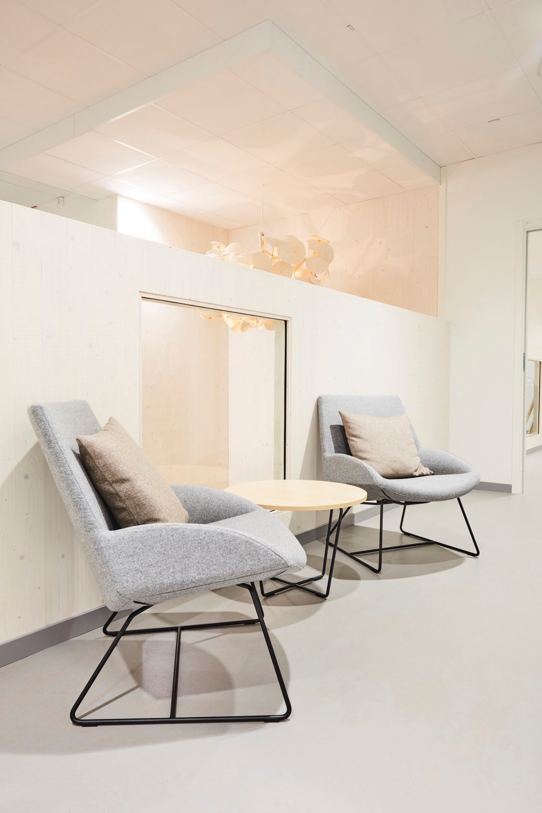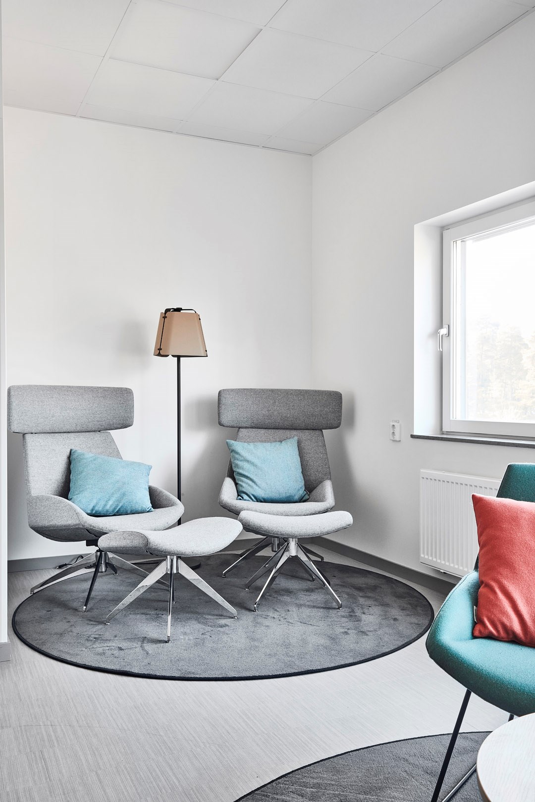 Personalrummet har en lugn och trivsam miljö med gott om plats för olika typer av sittande med soffa Platinum och fåtöljer Size. Mattorna Rossini skapar en ombonad känsla och är också ljuddämpande.