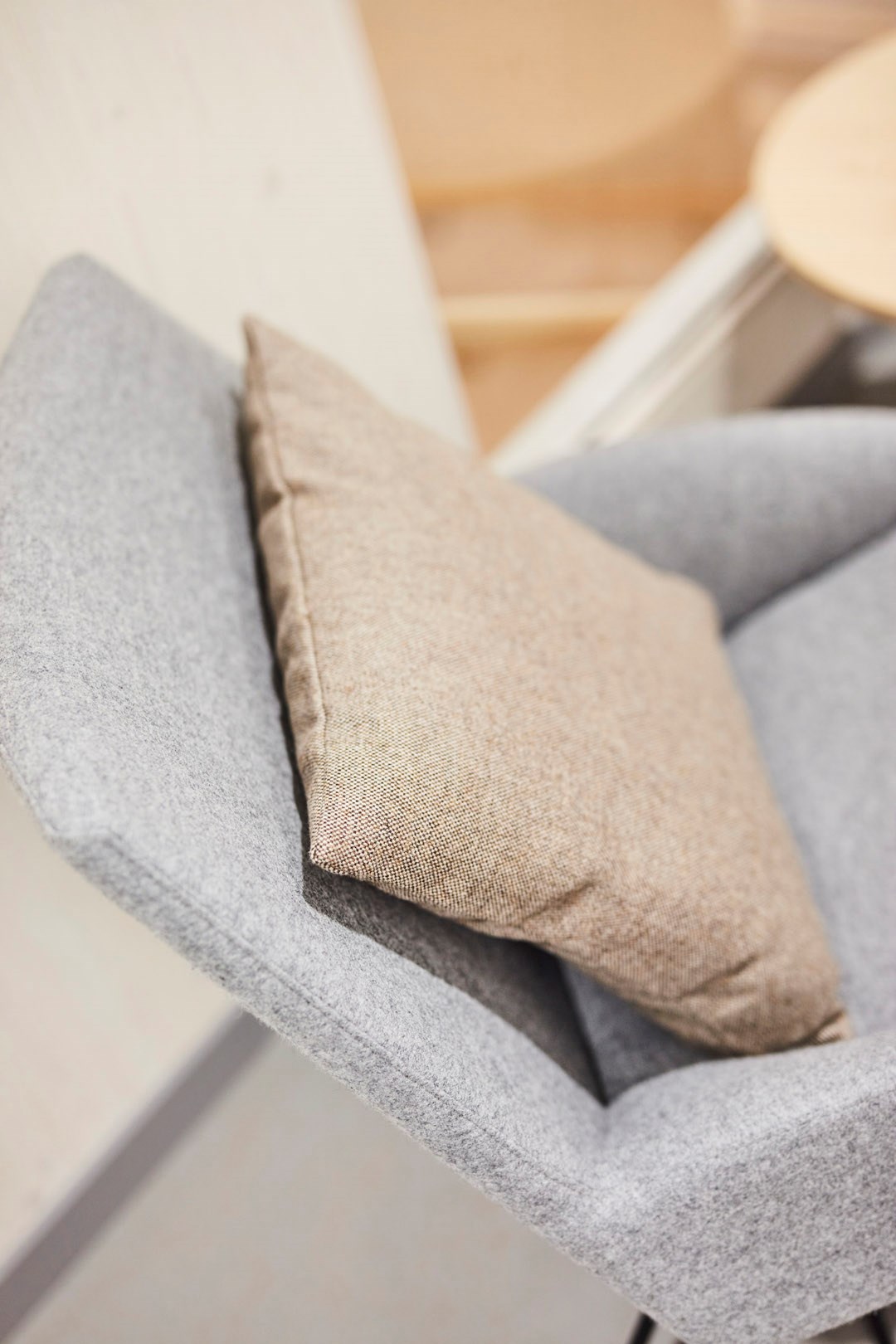 Passagen i korridoren ovanför trappan utnyttjas väl med sittplatser för en stunds rekreation eller mindre möten. Möblerna som använts är fåtölj Size, soffbord Size och Combo kudde.