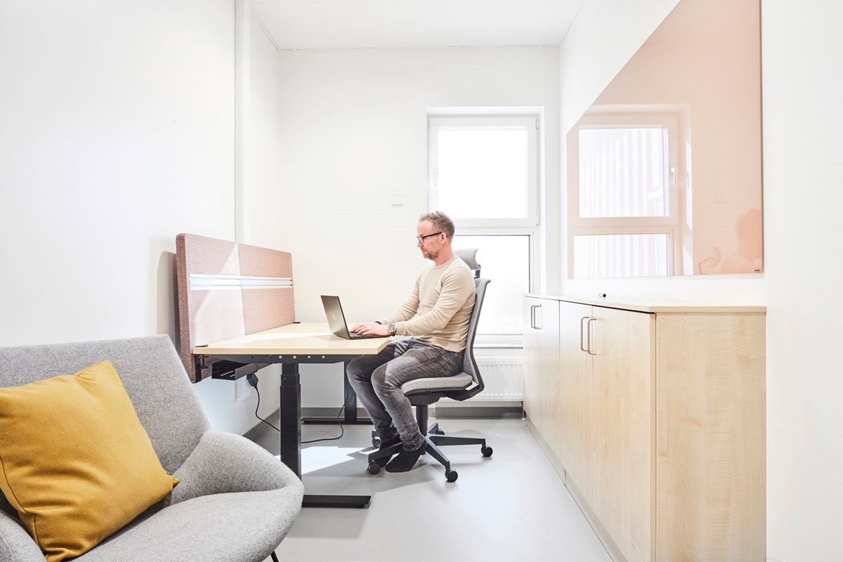 Arbetsplats med bord Rabo och stolar Rabo. På bilden syns också ljusbord Jeanette.