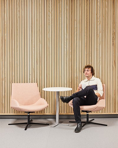 På fritids finns det gott om plats för både studier och roliga aktiviteter. Med Fixa boklåda kan böckerna enkelt frontas på olika sätt för att väcka läslusten. I nära anslutning finns en hängyta i varma färger som bjuder in till en stunds läsning eller häng med kompisarna. Här syns pelarbord Cross tillsammans med matta Rossini, fåtöljen Loop och modulsoffan Snake. Hörnsoffan Sigma med möbeltyget Era i ljusrosa är tillsammans med sittpuffarna Ross placerade i hörnet av det bakomliggande grupprummet. Ljudabsorbenterna Absoform sänker både ljudnivån och blir en fin dekor på väggen.