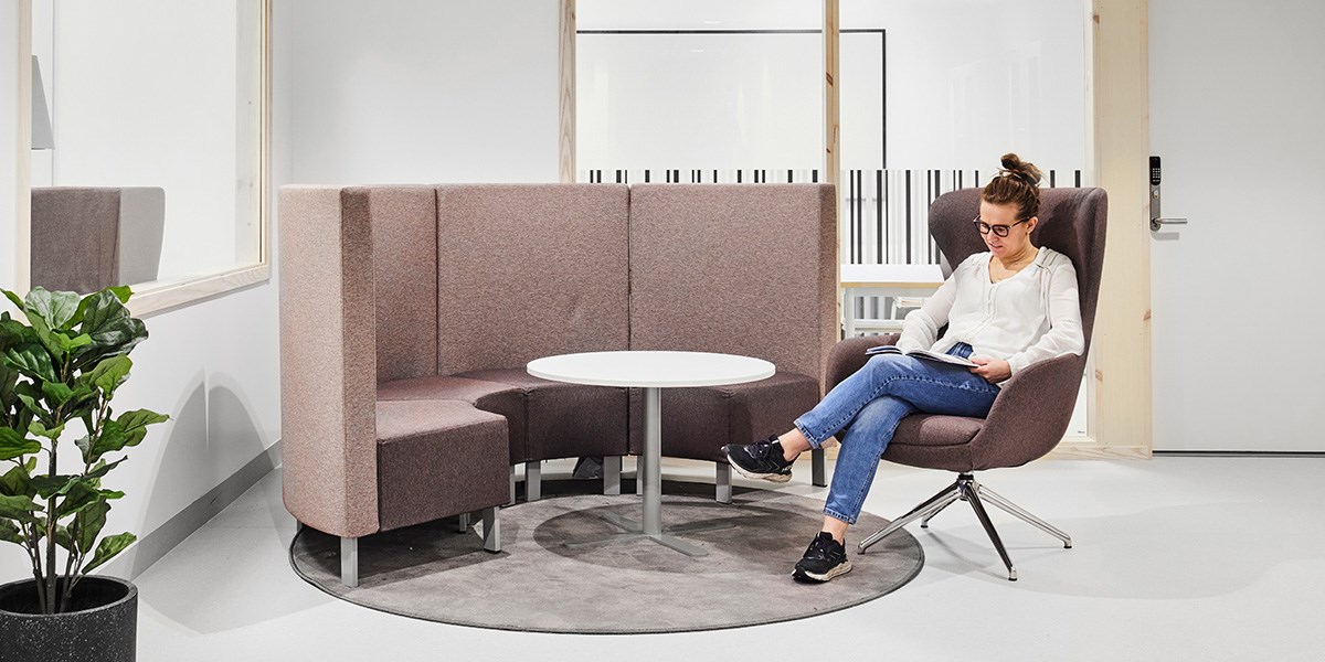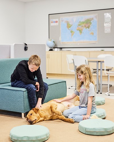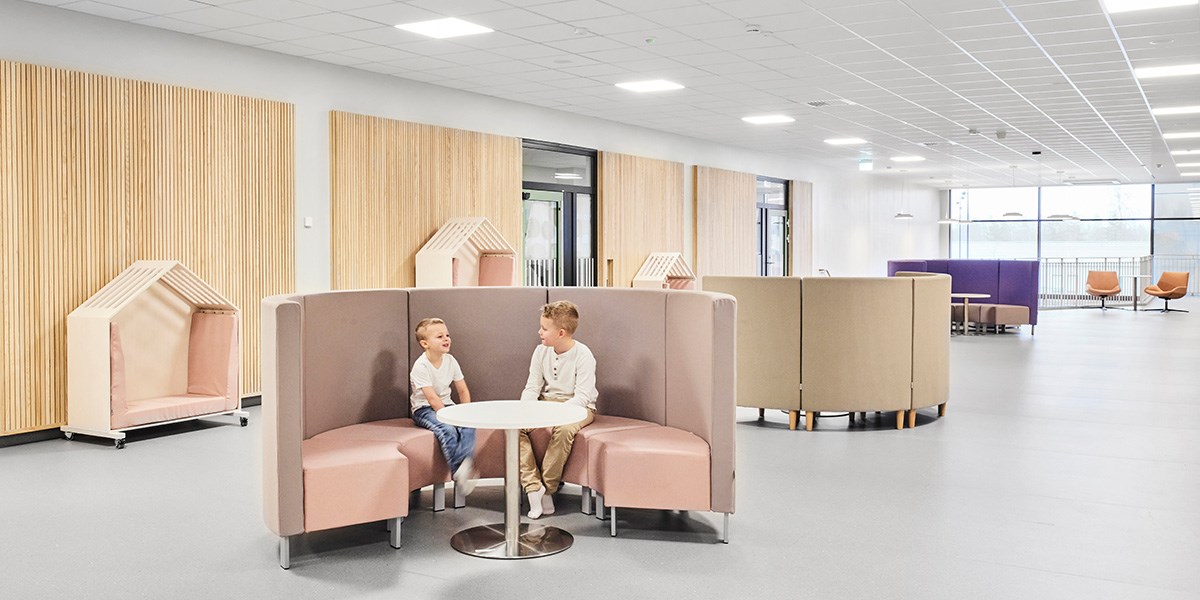 På skolan finns två rymliga och ljusa hallar med plats för olika typer av möten. Här kan eleverna hänga på rasten, tillsammans eller enskilt. Våra Fixa hus på hjul fungerar som ljuddämpande krypin där barnen kan krypa upp med en bok eller telefonen. Vissa hus erbjuder dessutom förvaring undertill. Modulsoffan Snake tillsammans med pelarbord Loke fungerar som små öar där barnen kan träffas för att prata om dagen. I fåtöljen Size och vid pelarbord Cross sitter en av lärarna på Elmeskolan.