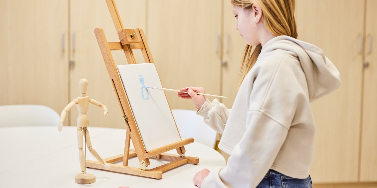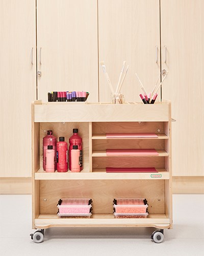 Vem vill inte sätta sig ner och skapa här? Elmeskolans bildsal har en harmonisk bas där vitt, grått och trä är återkommande inslag. Accentfärgen rosa på bord 12:38 och stol Matte skapar en levande och kreativ känsla. Här finns plats för skapande i alla dess former som underlättas med den lilla materialvagnen!