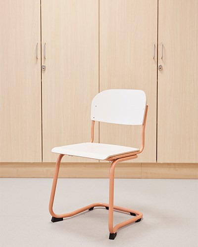 Utmed väggarna har varje elev en egen arbetsplats tack vare Skolbänk Mandal. Den ljuddämpande bordsytan tillsammans med den inbyggda förvaringen dämpar ljudet och tar bort springet. Stol Matte gas på hjul gör att eleverna snabbt kan svänga ut från sin plats när läraren söker elevernas uppmärksamhet eller tvärt om. Den ljudabsorberande golvskärmen Elme, även kallad "Elmeskärmen", skapar avgränsning och kan fungera som en personlig anslagstavla för bilder och scheman.