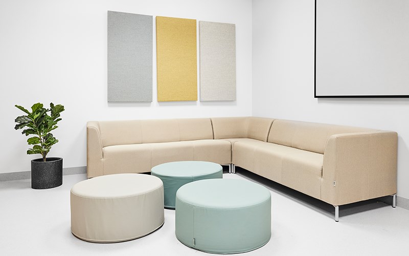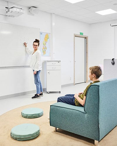 Presentationsytan är möblerad med soffa Part, sittpuff Volt och hålls samman av matta Rossini. Läraren har ingen kateder utan använder ståpulpet Elling whiteboard och projektor vid presentationen.