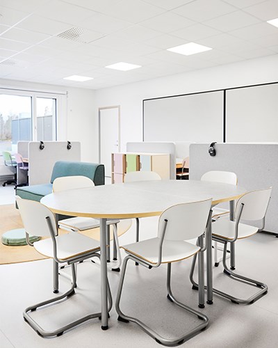 Centralt placerat i klassrummet står ett ovalt Bord 12:38 med ljuddämpande linoleumyta och Stol Matte på medstativ som avger minimalt med ljud. Vid bordet finns oftast läraren för att hjälpa enskilda elever eller för att ha en genomgång för en mindre grupp. Detta skapar trygghet för de elever som jobbar bäst nära läraren.
