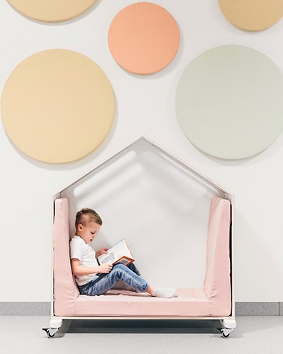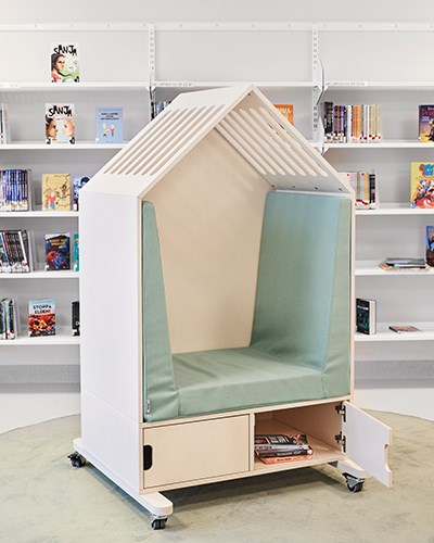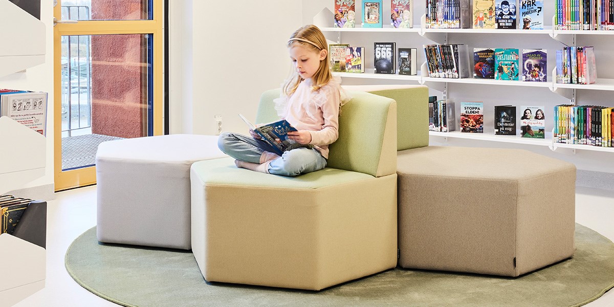 I en av korridorerna finns ingången till biblioteket. En ljus och fräsch yta där böckerna är samlade på det vita och öppna hyllsystemet Wille. När barnen har valt sin bok bjuder biblioteket på en hel del mysiga sittplatser och krypin i olika former. Fixa svängd och Fixa husen erbjuder både förvaring och sittyta. Tack vare hjulen blir modulerna mobila och kan med enkelhet flyttas runt efter behov. De mjuka sittdynorna (här med påbyggd rygg) skapar en fin oas där barnen kan sitta enskilt eller mötas och diskutera böckernas innehåll. Matta Rossini fungerar ljuddämpande tillsammans med de mjuka möblerna och skapar dessutom ett mysigt intryck.