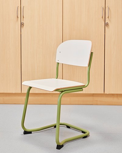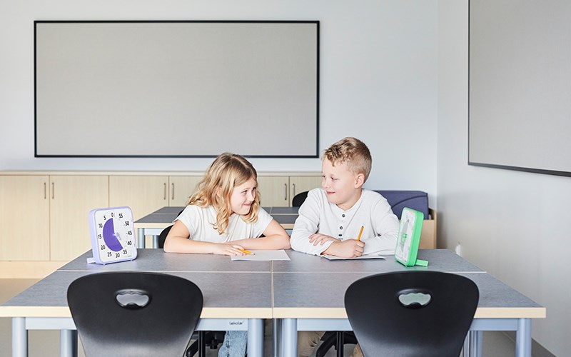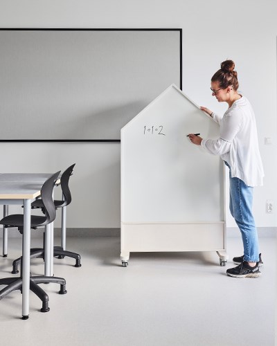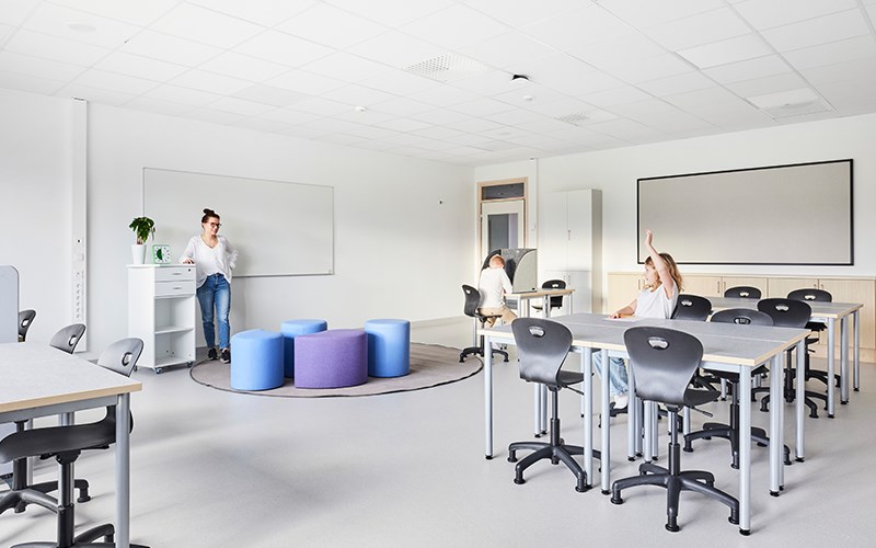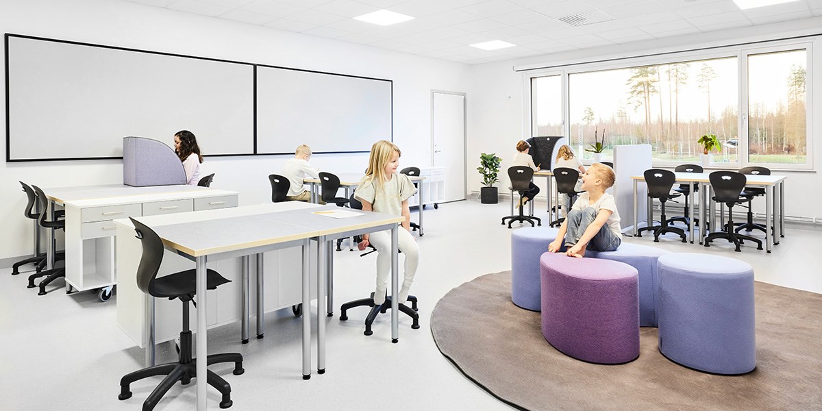Skolans klassrum har en bas med Karoline och 12:38-bord tillsammans med Norden elevförvaring. Ljust, fräscht och funktionellt! Alla möbler kan med enkelhet förflyttas för att skapa anpassade lärsituationer. Moviflexmekanismen på Karoline gör att barnen kan vippa på sitsen åt alla håll, vilket uppmuntrar ett aktivt sittande. Dessutom har stolen ett plastskal av 100 % återvunnet material vilket gör den till en miljöhjälte! Matta Rossini tillsammans med sittpuffarna Volt mjukar upp och ljuddämpar. Det finns även bordsskärmar att tillgå för de barn som vill skärma av och fokusera bättre. Här syns även populära kompensatoriska hjälpmedel som Time Timer®, bordsskärm med förvaring och vridblock.