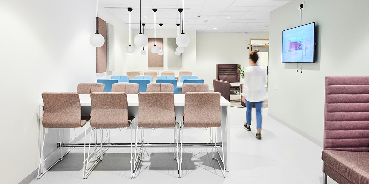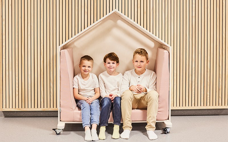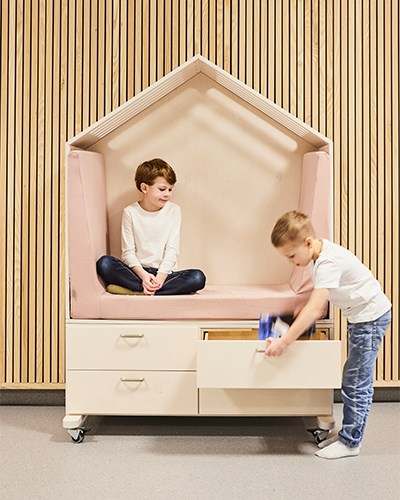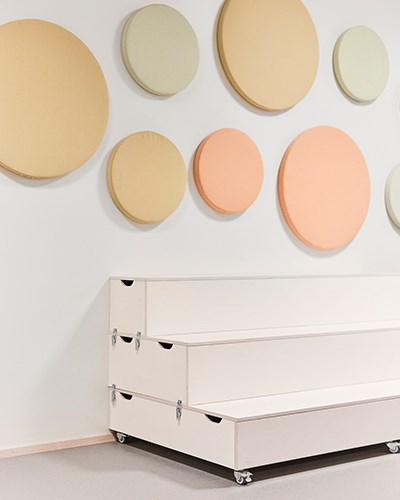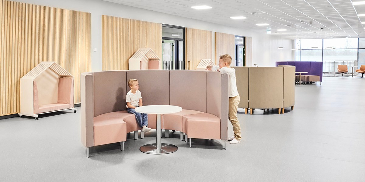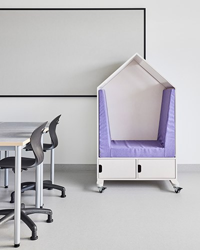 På skolan finns två ljusa och fräscha korridorer och allmänutrymmen där elever och lärare kan mötas mellan lektionerna. Här finns också plats för avskärmande egentid, elevernas senaste konstprojekt och rastsamtal. Våra Fixa hus på hjul fungerar som ljuddämpande krypin där barnen kan krypa upp med en bok eller telefonen. Vissa hus erbjuder dessutom förvaring undertill. Vår modulsoffa Snake bildar små öar tillsammans med pelarbord Loke där barnen kan mötas på rasterna. I fåtöljen Size och vid pelarbord Cross sitter en av lärarna på skolan. Med ljudabsorbenterna Absoform på väggarna sänks ljudvolymen och fungerar även som en fin dekor ovanför både scentrappa och Fixa hus.